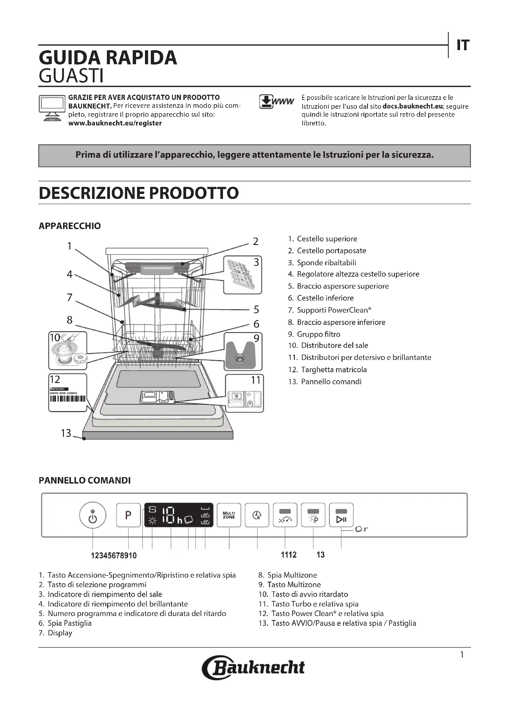 Prima di utilizzare l’apparecchio, leggere attentamente le Istruzioni per la sicurezza. APPARECCHIO DESCRIZIONE PRODOTTO 1. Cestello superiore2. Cestello portaposate3. Sponde ribaltabili4. Regolatore altezza cestello superiore5. Braccio aspersore superiore6. Cestello inferiore7. Supporti PowerClean® 8. Braccio aspersore inferiore9. Gruppo ltro10. Distributore del sale11. Distributori per detersivo e brillantante12. Targhetta matricola13. Pannello comandi1. Tasto Accensione-Spegnimento/Ripristino e relativa spia2. Tasto di selezione programmi3. Indicatore di riempimento del sale4. Indicatore di riempimento del brillantante5. Numero programma e indicatore di durata del ritardo6. Spia Pastiglia7. Display8. Spia Multizone9. Tasto Multizone10. Tasto di avvio ritardato11. Tasto Turbo e relativa spia12. Tasto Power Clean® e relativa spia13. Tasto AVVIO/Pausa e relativa spia / Pastiglia GUIDA RAPIDA GUASTI PANNELLO COMANDI GRAZIE PER AVER ACQUISTATO UN PRODOTTO BAUKNECHT Per ricevere assistenza in modo più com-pleto, registrare il proprio apparecchio sul sito: www.bauknecht.eu/registerÈ possibile scaricare le Istruzioni per la sicurezza e le Istruzioni per l’uso dal sito docs.bauknecht.eu; seguire quindi le istruzioni riportate sul retro del presente libretto.1 2 3 4 5 6 7 8 9 1011 12 130000 000 00000 Service: