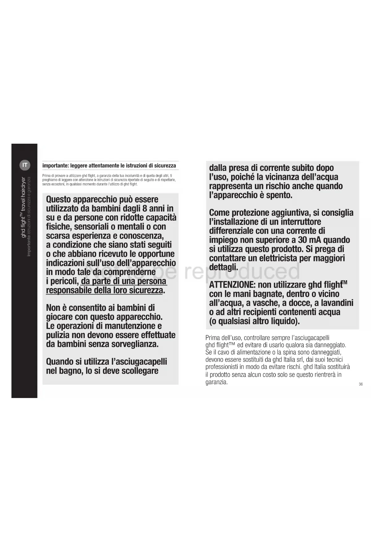 con le mani bagnate, dentro o vicino all’acqua, a vasche, a docce, a lavandini o ad altri recipienti contenenti acqua (o qualsiasi altro liquido). Prima dell’uso, controllare sempre l’asciugacapelli ghd ight™ ed evitare di usarlo qualora sia danneggiato. Se il cavo di alimentazione o la spina sono danneggiati, devono essere sostituiti da ghd Italia srl, dai suoi tecnici professionisti in modo da evitare rischi. ghd Italia sostituirà il prodotto senza alcun costo solo se questo rientrerà in garanzia. importante: leggere attentamente le istruzioni di sicurezza Prima di provare a utilizzare ghd ight, a garanzia della tua incolumità e di quella degli altri, ti preghiamo di leggere con attenzione le istruzioni di sicurezza riportate di seguito e di rispettarle, senza eccezioni, in qualsiasi momento durante l’utilizzo di ghd ight. Questo apparecchio può essere utilizzato da bambini dagli 8 anni in su e da persone con ridotte capacità siche, sensoriali o mentali o con scarsa esperienza e conoscenza, a condizione che siano stati seguiti o che abbiano ricevuto le opportune indicazioni sull’uso dell’apparecchio in modo tale da comprenderne i pericoli, da parte di una persona responsabile della loro sicurezza. Non è consentito ai bambini di giocare con questo apparecchio. Le operazioni di manutenzione e pulizia non devono essere eettuate da bambini senza sorveglianza. Quando si utilizza l’asciugacapelli nel bagno, lo si deve scollegare Not to be reproduced3837