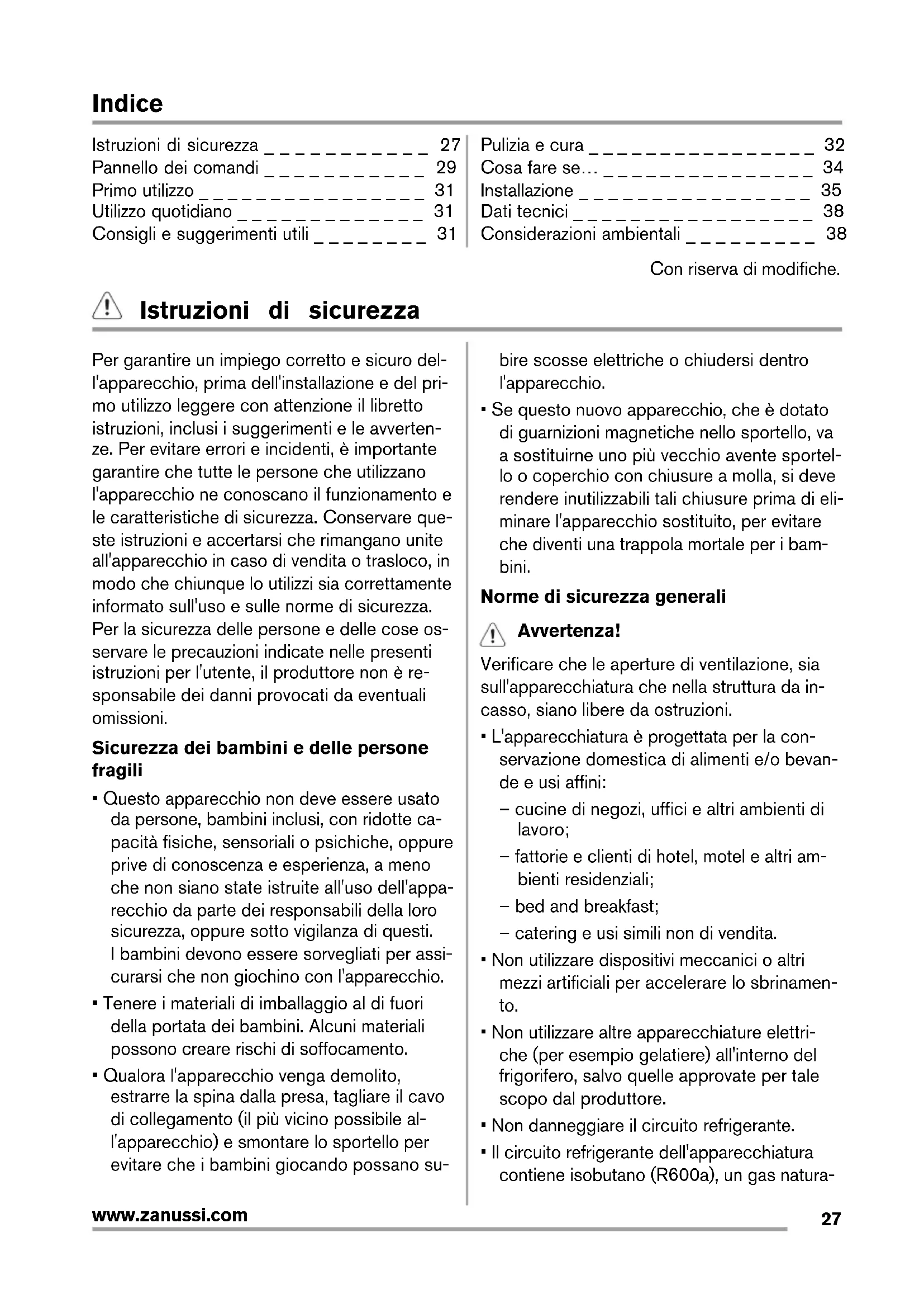 www.zanussi.comIndice Istruzioni di sicurezza _ _ _ _ _ _ _ _ _ _ _ 27 Pannello dei comandi _ _ _ _ _ _ _ _ _ _ _ 29 Primo utilizzo _ _ _ _ _ _ _ _ _ _ _ _ _ _ _ _ 31 Utilizzo quotidiano _ _ _ _ _ _ _ _ _ _ _ _ _ 31 Consigli e suggerimenti utili _ _ _ _ _ _ _ _ 31 Pulizia e cura _ _ _ _ _ _ _ _ _ _ _ _ _ _ _ _ 32 Cosa fare se… _ _ _ _ _ _ _ _ _ _ _ _ _ _ _ 34 Installazione _ _ _ _ _ _ _ _ _ _ _ _ _ _ _ _ 35 Dati tecnici _ _ _ _ _ _ _ _ _ _ _ _ _ _ _ _ _ 38 Considerazioni ambientali _ _ _ _ _ _ _ _ _ 38 Con riserva di modifiche. Istruzioni di sicurezza Per garantire un impiego corretto e sicuro del- l'apparecchio, prima dell'installazione e del pri- mo utilizzo leggere con attenzione il libretto istruzioni, inclusi i suggerimenti e le avverten- ze. Per evitare errori e incidenti, è importante garantire che tutte le persone che utilizzano l'apparecchio ne conoscano il funzionamento e le caratteristiche di sicurezza. Conservare que- ste istruzioni e accertarsi che rimangano unite all'apparecchio in caso di vendita o trasloco, in modo che chiunque lo utilizzi sia correttamente informato sull'uso e sulle norme di sicurezza. Per la sicurezza delle persone e delle cose os- servare le precauzioni indicate nelle presenti istruzioni per l'utente, il produttore non è re- sponsabile dei danni provocati da eventuali omissioni. Sicurezza dei bambini e delle persone fragili