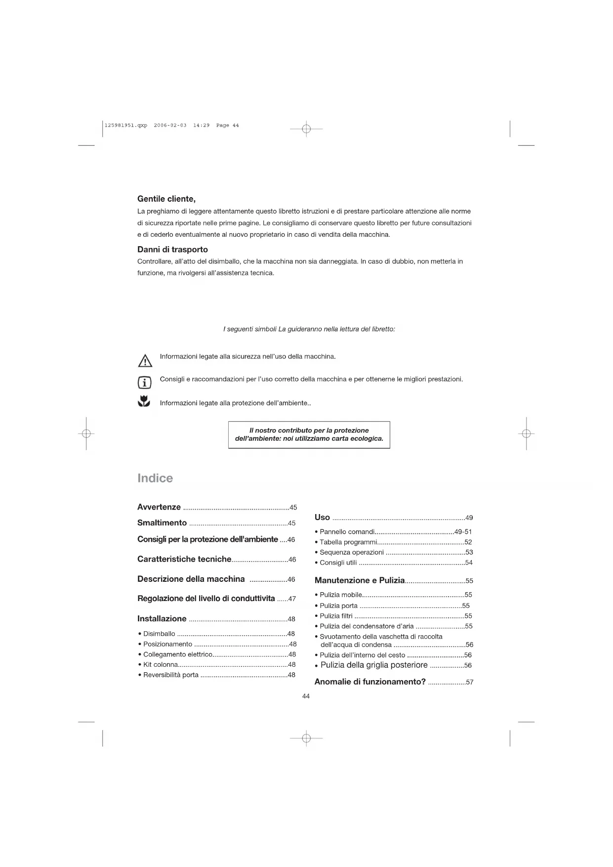 - Sind alle Aufstellungshinweise beachtet? 125981951.qxp 2006-02-03 14:29 Page 4344 Indice Gentile cliente, La preghiamo di leggere attentamente questo libretto istruzioni e di prestare particolare attenzione alle norme di sicurezza riportate nelle prime pagine. Le consigliamo di conservare questo libretto per future consultazioni e di cederlo eventualmente al nuovo proprietario in caso di vendita della macchina. Danni di trasporto Controllare, all’atto del disimballo, che la macchina non sia danneggiata. In caso di dubbio, non metterla in funzione, ma rivolgersi all’assistenza tecnica. I seguenti simboli La guideranno nella lettura del libretto: Informazioni legate alla sicurezza nell’uso della macchina. Consigli e raccomandazioni per l’uso corretto della macchina e per ottenerne le migliori prestazioni. Informazioni legate alla protezione dell’ambiente