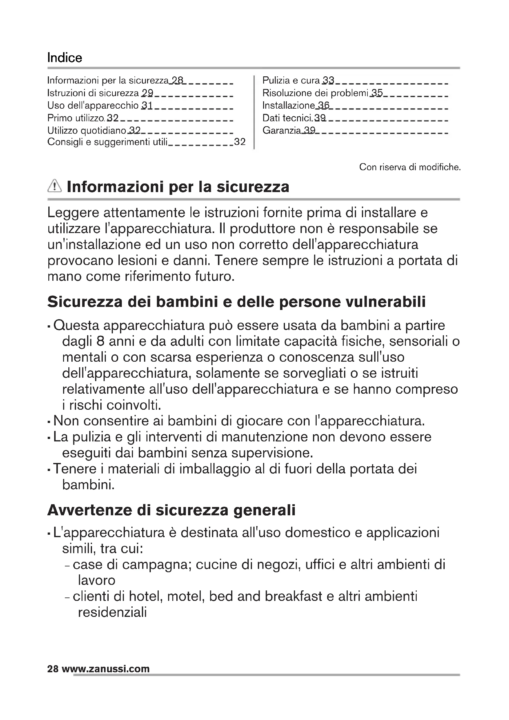 Garanzia Per ogni prodotto concediamo una garanzia di 2 anni a partire dalla data di consegna o dalla sua messa in funzione. (fa stato la data della fattura, del certificato di garanzia o dello scontrino d’acquisto) Nella garanzia sono comprese le spese di manodopera, di viaggio e del materiale. Dalla copertura sono esclusi il logoramento ed i danni causati da agenti esterni, intervento di terzi, utilizzo di ricambi non originali o dalla inosservanza delle prescrizioni d’istallazione ed istruzioni per l’uso. www.zanussi.com 39CONSIDERAZIONI SULL'AMBIENTE Riciclare i materiali con il simbolo . Buttare l'imballaggio negli appositi contenitori per il riciclaggio. Aiutare a proteggere l’ambiente e la salute umana e a riciclare rifiuti derivanti da apparecchiature elettriche ed elettroniche. Non smaltire le apparecchiature che riportano il simbolo insieme ai normali rifiuti domestici. Portare il prodotto al punto di riciclaggio più vicino o contattare il comune di residenza. Per la Svizzera: Dove portare gli apparecchi fuori uso? In qualsiasi negozio che vende apparecchi nuovi oppure si restituiscono ai centri di raccolta ufficiali della SENS oppure ai riciclatori ufficiali della SENS. La lista dei centri di raccolta ufficiali della SENS è visibile nel sito www.erecycling.ch 40 www.zanussi.comContents Safety information 41 Safety instructions 42 Operation 44 First use 45 Daily use 45 Hints and tips
