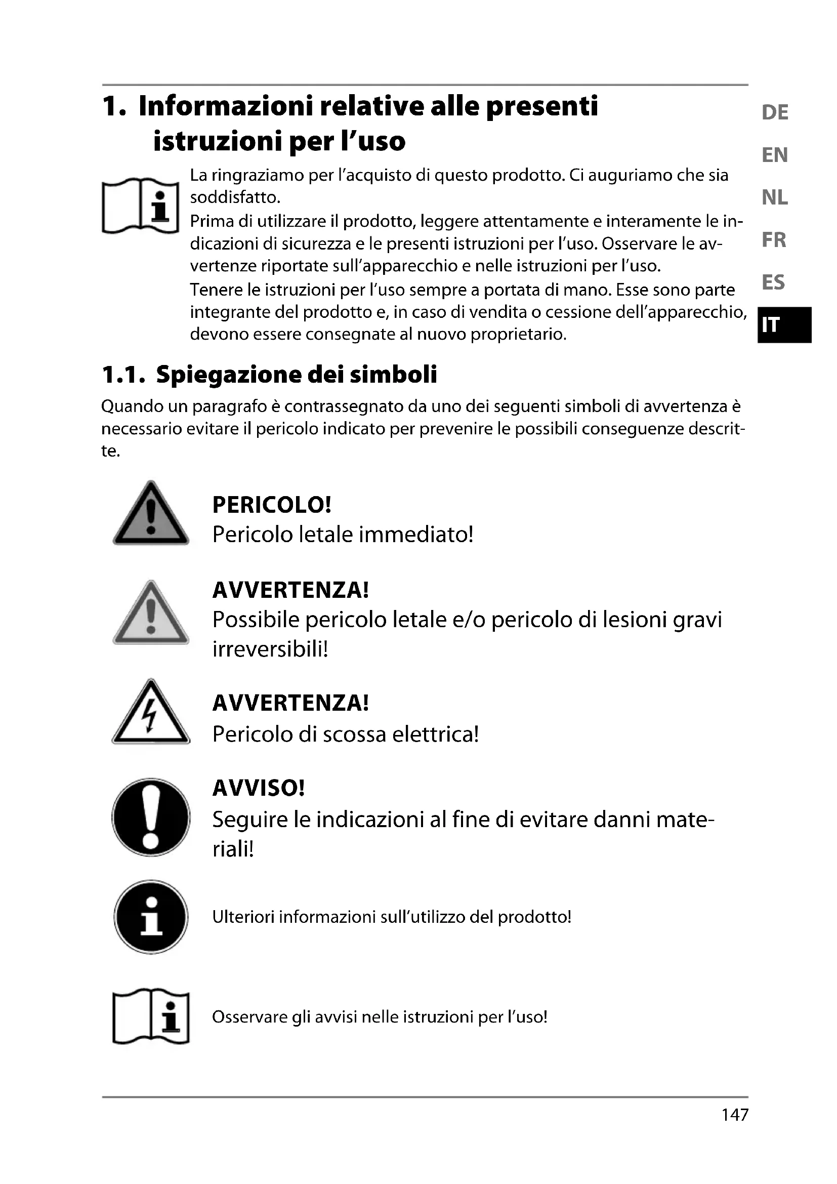 istruzioni per l’uso La ringraziamo per l’acquisto di questo prodotto. Ci auguriamo che sia soddisfatto. Prima di utilizzare il prodotto, leggere attentamente e interamente le in- dicazioni di sicurezza e le presenti istruzioni per l’uso. Osservare le av- vertenze riportate sull’apparecchio e nelle istruzioni per l’uso. Tenere le istruzioni per l’uso sempre a portata di mano. Esse sono parte integrante del prodotto e, in caso di vendita o cessione dell’apparecchio, devono essere consegnate al nuovo proprietario. 1.1. Spiegazione dei simboli Quando un paragrafo è contrassegnato da uno dei seguenti simboli di avvertenza è necessario evitare il pericolo indicato per prevenire le possibili conseguenze descrit- te. PERICOLO! Pericolo letale immediato! AVVERTENZA! Possibile pericolo letale e/o pericolo di lesioni gravi irreversibili! AVVERTENZA! Pericolo di scossa elettrica! AVVISO! Seguire le indicazioni al fine di evitare danni mate- riali! Ulteriori informazioni sull’utilizzo del prodotto! Osservare gli avvisi nelle istruzioni per l’uso! 43988 ML DS MSN 5006 1913 Content Final Rev1.indb 14743988 ML DS MSN 5006 1913 Content Final Rev1.indb 147 31.07.2019 11:25:1631.07.2019 11:25:16148