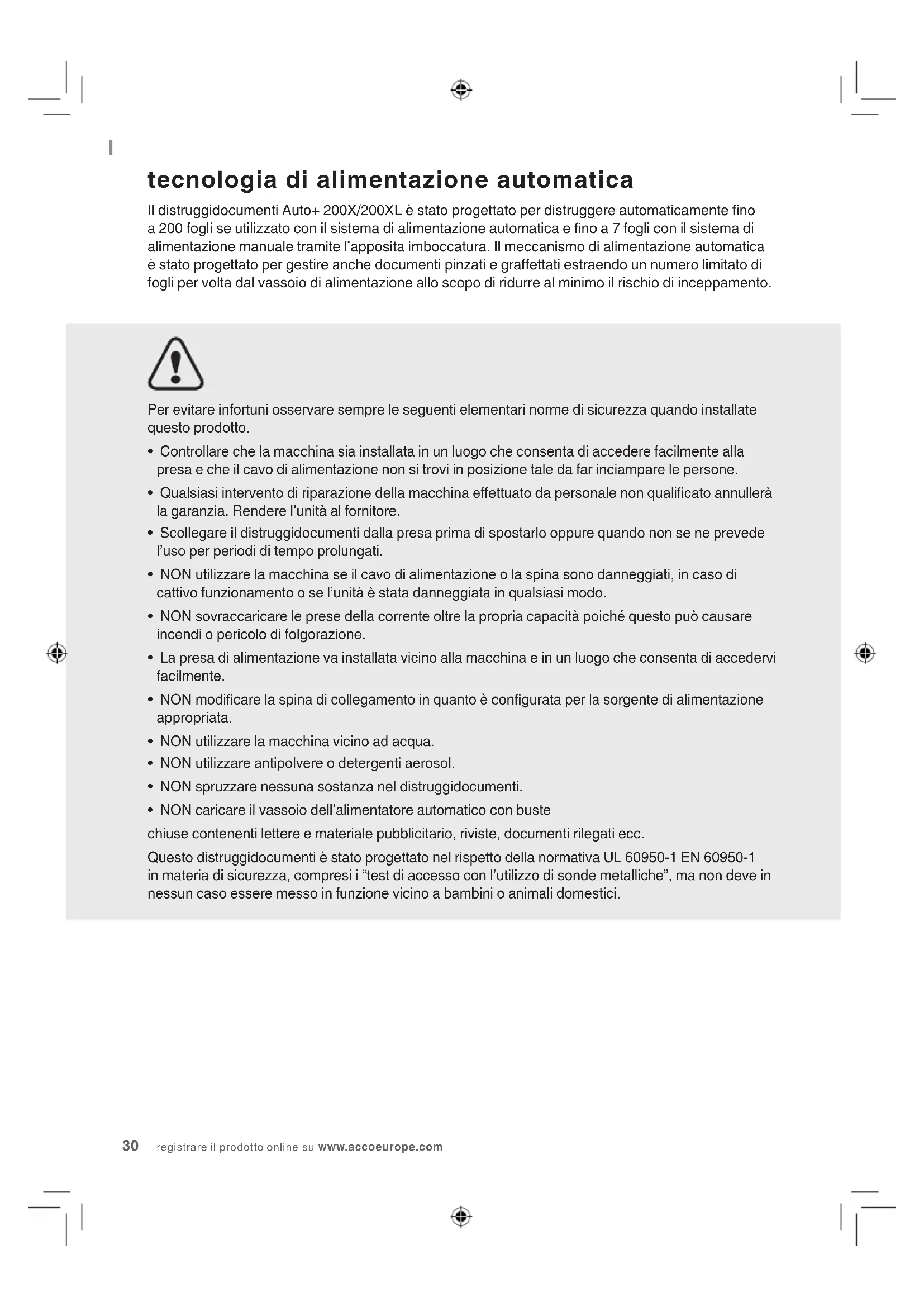 - NON caricare il vassoio dell’alimentatore automatico con buste chiuse contenenti lettere e materiale pubblicitario, riviste, documenti rilegati ecc. Questo distruggidocumenti è stato progettato nel rispetto della normativa UL 60950-1 EN 60950-1 in materia di sicurezza, compresi i “test di accesso con l’utilizzo di sonde metalliche”, ma non deve in nessun caso essere messo in funzione vicino a bambini o animali domestici. tecnologia di alimentazione automatica Il distruggidocumenti Auto+ 200X/200XL è stato progettato per distruggere automaticamente no a 200 fogli se utilizzato con il sistema di alimentazione automatica e no a 7 fogli con il sistema di alimentazione manuale tramite l’apposita imboccatura. Il meccanismo di alimentazione automatica è stato progettato per gestire anche documenti pinzati e graettati estraendo un numero limitato di fogli per volta dal vassoio di alimentazione allo scopo di ridurre al minimo il rischio di inceppamento.AUTO+ 200X&200XL