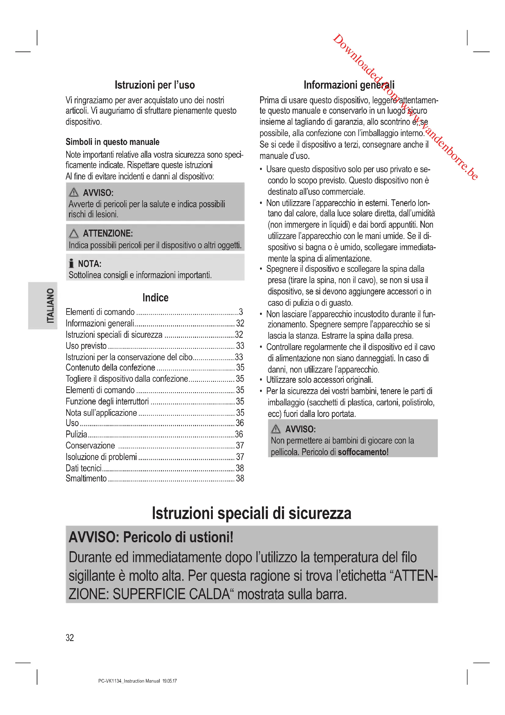 - Prima di procedere alla pulizia estrarre sempre la spina dalla presa di corrente. Attendere che il dispositivo si raffreddi. Downloaded from www.vandenborre.be37 PC-VK1134_Instruction Manual 19.05.17 ATTENZIONE: