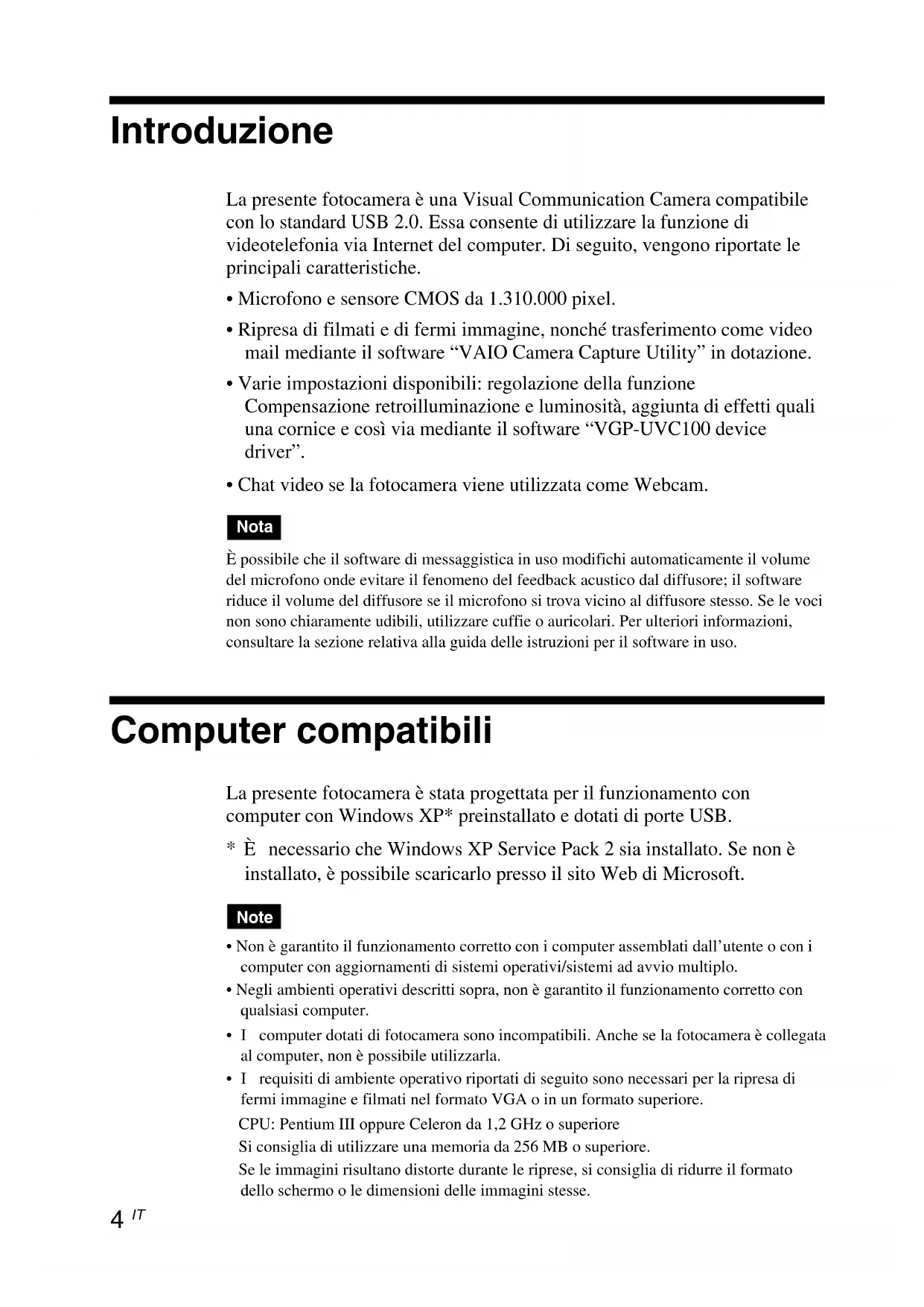 - Chat video se la fotocamera viene utilizzata come Webcam. Nota È possibile che il software di messaggistica in uso modifichi automaticamente il volume del microfono onde evitare il fenomeno del feedback acustico dal diffusore; il software riduce il volume del diffusore se il microfono si trova vicino al diffusore stesso. Se le voci non sono chiaramente udibili, utilizzare cuffie o auricolari. Per ulteriori informazioni, consultare la sezione relativa alla guida delle istruzioni per il software in uso. Computer compatibili La presente fotocamera è stata progettata per il funzionamento con computer con Windows XP* preinstallato e dotati di porte USB. *È necessario che Windows XP Service Pack 2 sia installato. Se non è installato, è possibile scaricarlo presso il sito Web di Microsoft. Note