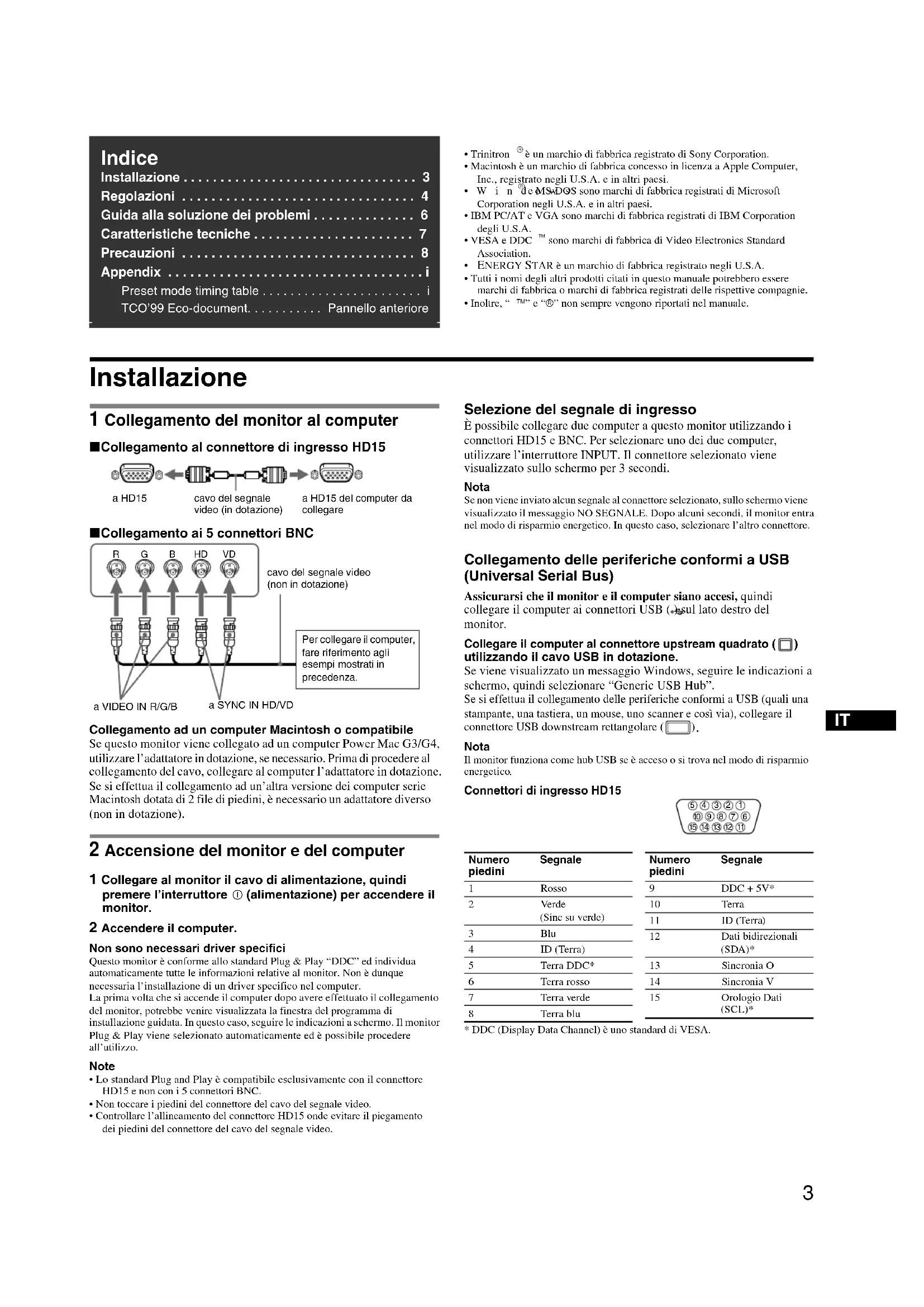 - Trinitron è un marchio di fabbrica registrato di Sony Corporation.• Macintosh è un marchio di fabbrica concesso in licenza a Apple Computer, Inc., registrato negli U.S.A. e in altri paesi.•Windows e MS-DOS sono marchi di fabbrica registrati di Microsoft Corporation negli U.S.A. e in altri paesi.• IBM PC/AT e VGA sono marchi di fabbrica registrati di IBM Corporation degli U.S.A.• VESA e DDC sono marchi di fabbrica di Video Electronics Standard Association.