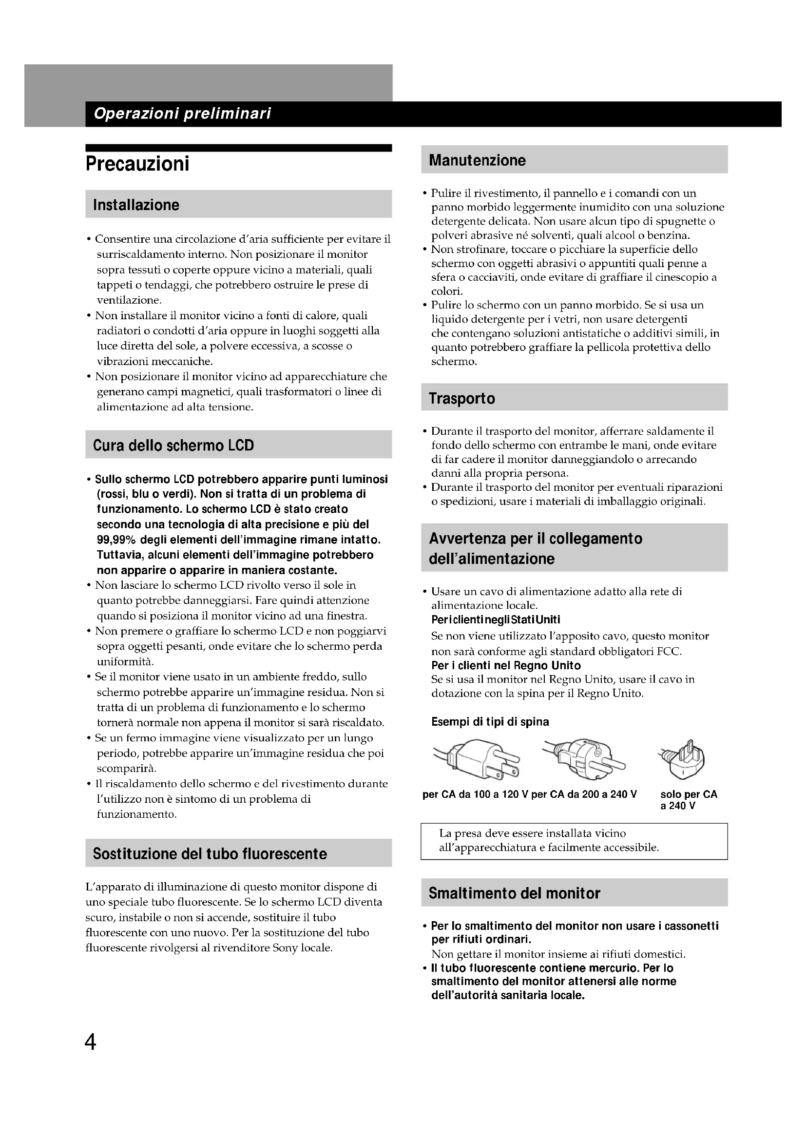 - Il riscaldamento dello schermo e del rivestimento durante l’utilizzo non è sintomo di un problema di funzionamento. Sostituzione del tubo fluorescente L’apparato di illuminazione di questo monitor dispone di uno speciale tubo fluorescente. Se lo schermo LCD diventa scuro, instabile o non si accende, sostituire il tubo fluorescente con uno nuovo. Per la sostituzione del tubo fluorescente rivolgersi al rivenditore Sony locale. per CA da 100 a 120 V per CA da 200 a 240 V solo per CA a 240 V5 Operazioni preliminari