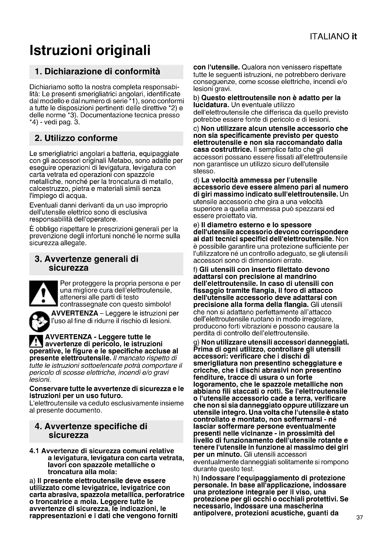 Istruzioni originali Dichiariamo sotto la nostra completa responsabi- lità: Le presenti smerigliatrici angolari, identificate dal modello e dal numero di serie *1), sono conformi a tutte le disposizioni pertinenti delle direttive *2) e delle norme *3). Documentazione tecnica presso *4) - vedi pag. 3. Le smerigliatrici angolari a batteria, equipaggiate con gli accessori originali Metabo, sono adatte per eseguire operazioni di levigatura, levigatura con carta vetrata ed operazioni con spazzole metalliche, nonché per la troncatura di metallo, calcestruzzo, pietra e materiali simili senza l'impiego di acqua. Eventuali danni derivanti da un uso improprio dell'utensile elettrico sono di esclusiva responsabilità dell'operatore. È obbligo rispettare le prescrizioni generali per la prevenzione degli infortuni nonché le norme sulla sicurezza allegate. Per proteggere la propria persona e per una migliore cura dell'elettroutensile, attenersi alle parti di testo contrassegnate con questo simbolo! AVVERTENZA – Leggere le istruzioni per l’uso al fine di ridurre il rischio di lesioni. AVVERTENZA - Leggere tutte le avvertenze di pericolo, le istruzioni operative, le figure e le specifiche accluse al presente elettroutensile. Il mancato rispetto di tutte le istruzioni sottoelencate potrà comportare il pericolo di scosse elettriche, incendi e/o gravi lesioni. Conservare tutte le avvertenze di sicurezza e le istruzioni per un uso futuro. L'elettroutensile va ceduto esclusivamente insieme al presente documento.