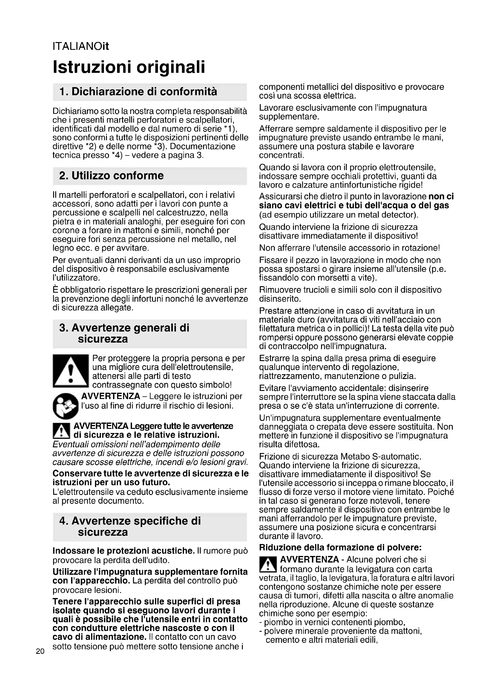 Dichiariamo sotto la nostra completa responsabilità che i presenti martelli perforatori e scalpellatori, identificati dal modello e dal numero di serie *1), sono conformi a tutte le disposizioni pertinenti delle direttive *2) e delle norme *3). Documentazione tecnica presso *4) – vedere a pagina 3. Il martelli perforatori e scalpellatori, con i relativi accessori, sono adatti per i lavori con punte a percussione e scalpelli nel calcestruzzo, nella pietra e in materiali analoghi, per eseguire fori con corone a forare in mattoni e simili, nonché per eseguire fori senza percussione nel metallo, nel legno ecc. e per avvitare. Per eventuali danni derivanti da un uso improprio del dispositivo è responsabile esclusivamente l’utilizzatore. È obbligatorio rispettare le prescrizioni generali per la prevenzione degli infortuni nonché le avvertenze di sicurezza allegate. Per proteggere la propria persona e per una migliore cura dell'elettroutensile, attenersi alle parti di testo contrassegnate con questo simbolo! AVVERTENZA – Leggere le istruzioni per l'uso al fine di ridurre il rischio di lesioni. AVVERTENZA Leggere tutte le avvertenze di sicurezza e le relative istruzioni. Eventuali omissioni nell’adempimento delle avvertenze di sicurezza e delle istruzioni possono causare scosse elettriche, incendi e/o lesioni gravi. Conservare tutte le avvertenze di sicurezza e le istruzioni per un uso futuro. L'elettroutensile va ceduto esclusivamente insieme al presente documento. Indossare le protezioni acustiche. Il rumore può provocare la perdita dell'udito. Utilizzare l'impugnatura supplementare fornita con l'apparecchio. La perdita del controllo può provocare lesioni. Tenere l'apparecchio sulle superfici di presa isolate quando si eseguono lavori durante i quali è possibile che l'utensile entri in contatto con condutture elettriche nascoste o con il cavo di alimentazione. Il contatto con un cavo sotto tensione può mettere sotto tensione anche i componenti metallici del dispositivo e provocare così una scossa elettrica. Lavorare esclusivamente con l'impugnatura supplementare. Afferrare sempre saldamente il dispositivo per le impugnature previste usando entrambe le mani, assumere una postura stabile e lavorare concentrati. Quando si lavora con il proprio elettroutensile, indossare sempre occhiali protettivi, guanti da lavoro e calzature antinfortunistiche rigide! Assicurarsi che dietro il punto in lavorazione non ci siano cavi elettrici e tubi dell'acqua o del gas (ad esempio utilizzare un metal detector). Quando interviene la frizione di sicurezza disattivare immediatamente il dispositivo! Non afferrare l'utensile accessorio in rotazione! Fissare il pezzo in lavorazione in modo che non possa spostarsi o girare insieme all'utensile (p.e. fissandolo con morsetti a vite). Rimuovere trucioli e simili solo con il dispositivo disinserito. Prestare attenzione in caso di avvitatura in un materiale duro (avvitatura di viti nell'acciaio con filettatura metrica o in pollici)! La testa della vite può rompersi oppure possono generarsi elevate coppie di contraccolpo nell'impugnatura. Estrarre la spina dalla presa prima di eseguire qualunque intervento di regolazione, riattrezzamento, manutenzione o pulizia. Evitare l'avviamento accidentale: disinserire sempre l'interruttore se la spina viene staccata dalla presa o se c'è stata un'interruzione di corrente. Un'impugnatura supplementare eventualmente danneggiata o crepata deve essere sostituita. Non mettere in funzione il dispositivo se l'impugnatura risulta difettosa. Frizione di sicurezza Metabo S-automatic. Quando interviene la frizione di sicurezza, disattivare immediatamente il dispositivo! Se l'utensile accessorio si inceppa o rimane bloccato, il flusso di forze verso il motore viene limitato. Poiché in tal caso si generano forze notevoli, tenere sempre saldamente il dispositivo con entrambe le mani afferrandolo per le impugnature previste, assumere una posizione sicura e concentrarsi durante il lavoro. Riduzione della formazione di polvere: AVVERTENZA - Alcune polveri che si formano durante la levigatura con carta vetrata, il taglio, la levigatura, la foratura e altri lavori contengono sostanze chimiche note per essere causa di tumori, difetti alla nascita o altre anomalie nella riproduzione. Alcune di queste sostanze chimiche sono per esempio: - piombo in vernici contenenti piombo, - polvere minerale proveniente da mattoni, cemento e altri materiali edili, Istruzioni originali