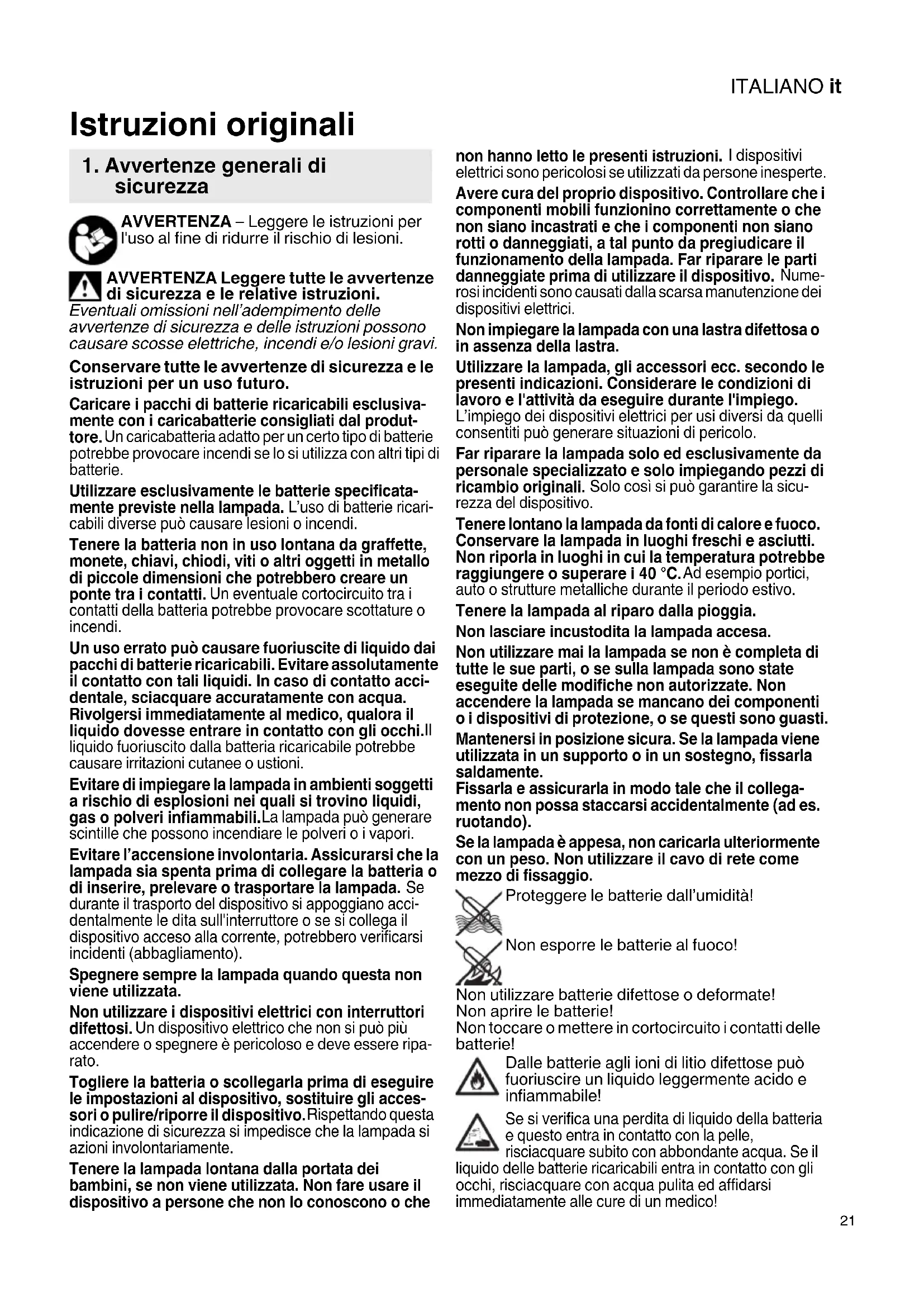 AVVERTENZA – Leggere le istruzioni per l'uso al fine di ridurre il rischio di lesioni. AVVERTENZA Leggere tutte le avvertenze di sicurezza e le relative istruzioni. Eventuali omissioni nell’adempimento delle avvertenze di sicurezza e delle istruzioni possono causare scosse elettriche, incendi e/o lesioni gravi. Conservare tutte le avvertenze di sicurezza e le istruzioni per un uso futuro. Caricare i pacchi di batterie ricaricabili esclusiva- mente con i caricabatterie consigliati dal produt- tore. Un caricabatteria adatto per un certo tipo di batterie potrebbe provocare incendi se lo si utilizza con altri tipi di batterie. Utilizzare esclusivamente le batterie specificata- mente previste nella lampada. L’uso di batterie ricari- cabili diverse può causare lesioni o incendi. Tenere la batteria non in uso lontana da graffette, monete, chiavi, chiodi, viti o altri oggetti in metallo di piccole dimensioni che potrebbero creare un ponte tra i contatti. Un eventuale cortocircuito tra i contatti della batteria potrebbe provocare scottature o incendi. Un uso errato può causare fuoriuscite di liquido dai pacchi di batterie ricaricabili. Evitare assolutamente il contatto con tali liquidi. In caso di contatto acci- dentale, sciacquare accuratamente con acqua. Rivolgersi immediatamente al medico, qualora il liquido dovesse entrare in contatto con gli occhi.