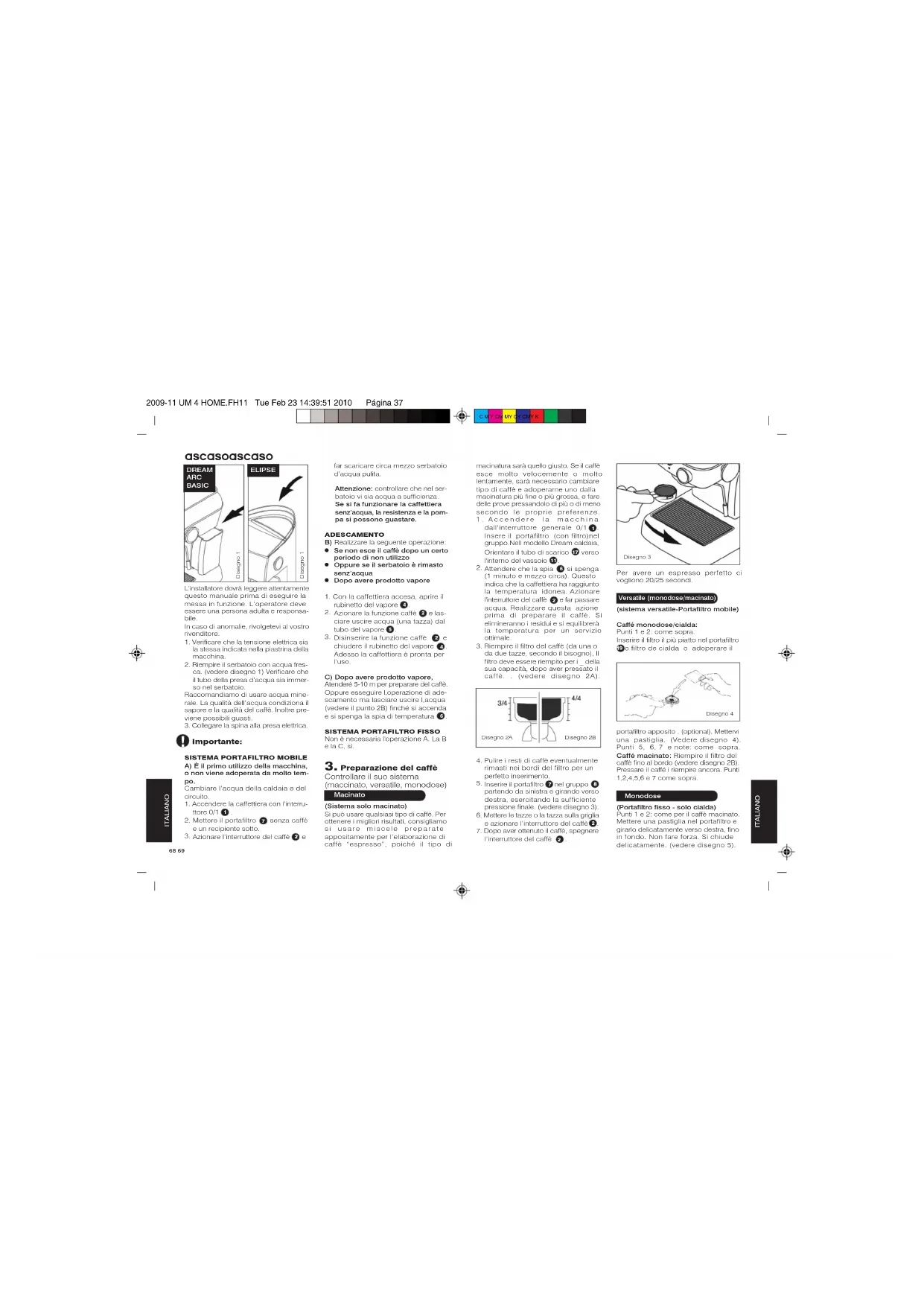 32009-11 UM 4 HOME.FH11 Tue Feb 23 14:39:51 2010 Página 37 C M Y CM MY CY CMY KLinstallatore dovrà leggere attentamentequesto manuale prima di eseguire lamessa in funzione. Loperatore deveessere una persona adulta e responsabile.In caso di anomalie, rivolgetevi al vostrorivenditore.1. Verificare che la tensione elettrica siala stessa indicata nella piastrina dellamacchina.2. Riempire il serbatoio con acqua fresca. (vedere disegno 1) Verificare cheil tubo della presa dacqua sia immerso nel serbatoio.Raccomandiamo di usare acqua minerale. La qualità dellacqua condiziona ilsapore e la qualità del caffè. Inoltre previene possibili guasti.3. Collegare la spina alla presa elettrica. Importante: SISTEMA PORTAFILTRO MOBILEA) È il primo utilizzo della macchina,o non viene adoperata da molto tem po. Cambiare lacqua della caldaia e delcircuito.1. Accendere la caffettiera con linterruttore 0/1