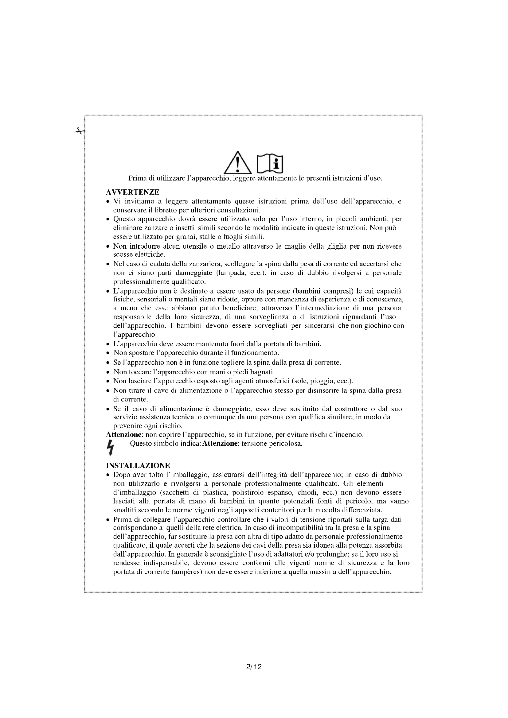 Prima di utilizzare l’apparecchio, leggere attentamente le presenti istruzioni d’uso. AVVERTENZE Vi invitiamo a leggere attentamente queste istruzioni prima dell’uso dell’apparecchio, e conservare il libretto per ulteriori consultazioni. Questo apparecchio dovrà essere utilizzato solo per l’uso interno, in piccoli ambienti, per eliminare zanzare o insetti simili secondo le modalità indicate in queste istruzioni. Non può essere utilizzato per granai, stalle o luoghi simili. Non introdurre alcun utensile o metallo attraverso le maglie della gliglia per non ricevere scosse elettriche. Nel caso di caduta della zanzariera, scollegare la spina dalla pesa di corrente ed accertarsi che non ci siano parti danneggiate (lampada, ecc.): in caso di dubbio rivolgersi a personale professionalmente qualificato. L’apparecchio non è destinato a essere usato da persone (bambini compresi) le cui capacità fisiche, sensoriali o mentali siano ridotte, oppure con mancanza di esperienza o di conoscenza, a meno che esse abbiano potuto beneficiare, attraverso l’intermediazione di una persona responsabile della loro sicurezza, di una sorveglianza o di istruzioni riguardanti l’uso dell’apparecchio. I bambini devono essere sorvegliati per sincerarsi che non giochino con l’apparecchio. L’apparecchio deve essere mantenuto fuori dalla portata di bambini. Non spostare l’apparecchio durante il funzionamento. Se l’apparecchio non è in funzione togliere la spina dalla presa di corrente. Non toccare l’apparecchio con mani o piedi bagnati. Non lasciare l’apparecchio esposto agli agenti atmosferici (sole, pioggia, ecc.). Non tirare il cavo di alimentazione o l’apparecchio stesso per disinserire la spina dalla presa di corrente. Se il cavo di alimentazione è danneggiato, esso deve sostituito dal costruttore o dal suo servizio assistenza tecnica o comunque da una persona con qualifica similare, in modo da prevenire ogni rischio. Attenzione: non coprire l’apparecchio, se in funzione, per evitare rischi d’incendio.