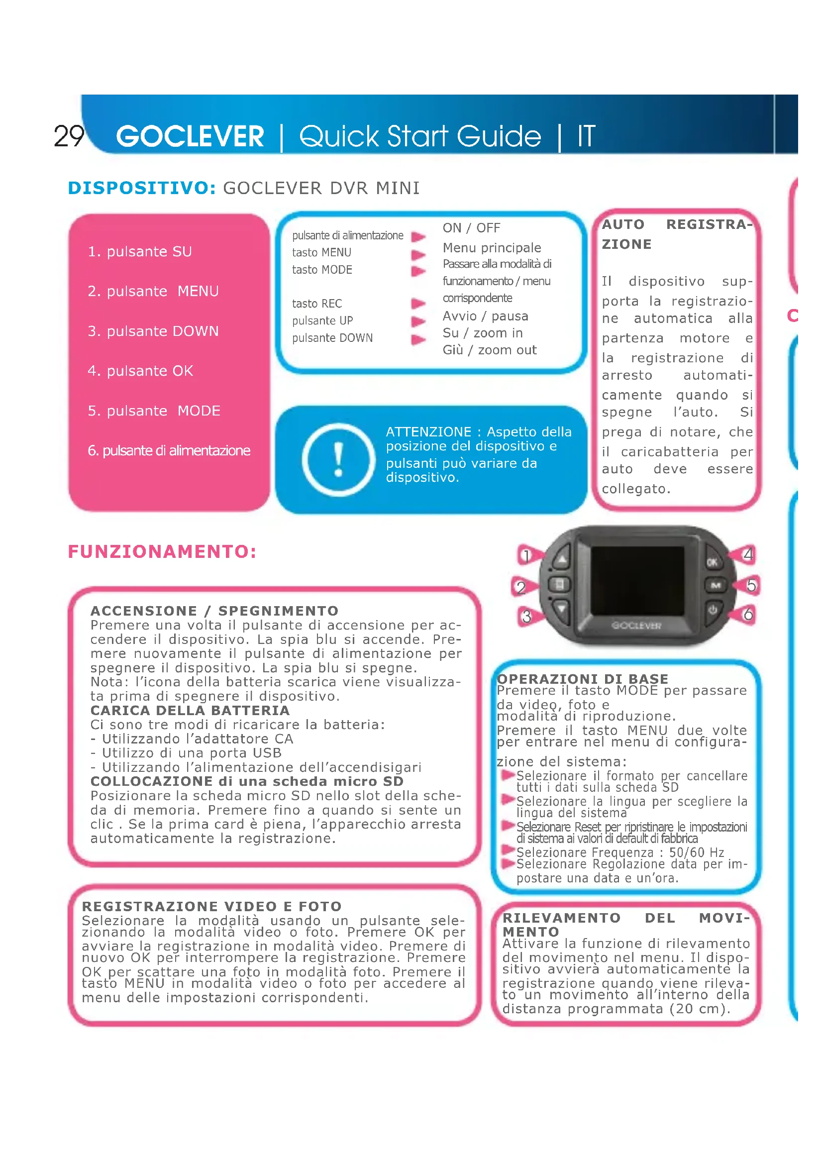 su register.goclever.com Registra il tuo prodotto GOCLEVER per ottenere di più! Grazie per aver scelto GOCLEVER voi! Vogliamo farvi godere il vostro acquisto al massimo, ed inizia con pochi semplici passi di registrazione . la registrazione durerà pochi minuti. Vai su www.goclever.com per ottenere di più . Non perdere l‘occasione di trovare alcuni dei vantaggi: -Il periodo di garanzia per gli accessori in dotazione con la fotocamera è di 6 mesi dalla data di vendita, con l‘eccezione di danni meccanici, - Consigli pratici e rapido supporto tecnico, - Promemoria sugli aggiornamenti del firmware che manterrà il vostro prodotto up-to - the-minute, - Anteprime esclusive di nuovi prodotti, - Aggiornamenti software gratuiti