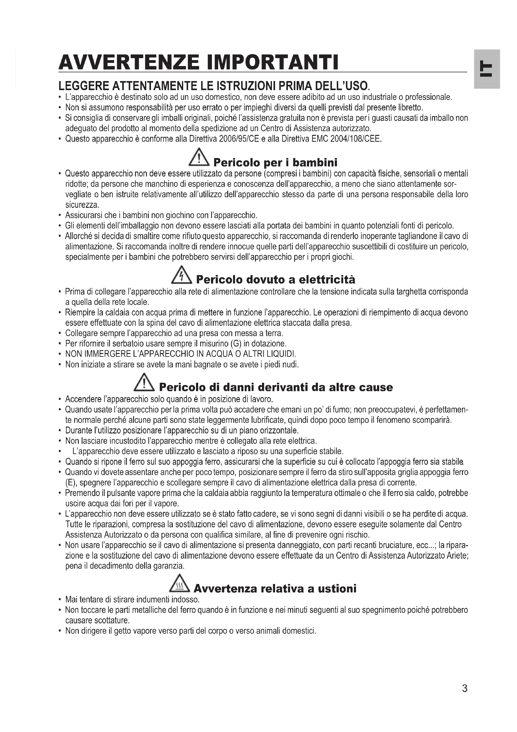 - Non usare l’apparecchio se il cavo di alimentazione si presenta danneggiato, con parti recanti bruciature, ecc...; la ripara- zione e la sostituzione del cavo di alimentazione devono essere effettuate da un Centro di Assistenza Autorizzato Ariete; pena il decadimento della garanzia. Avvertenza relativa a ustioni