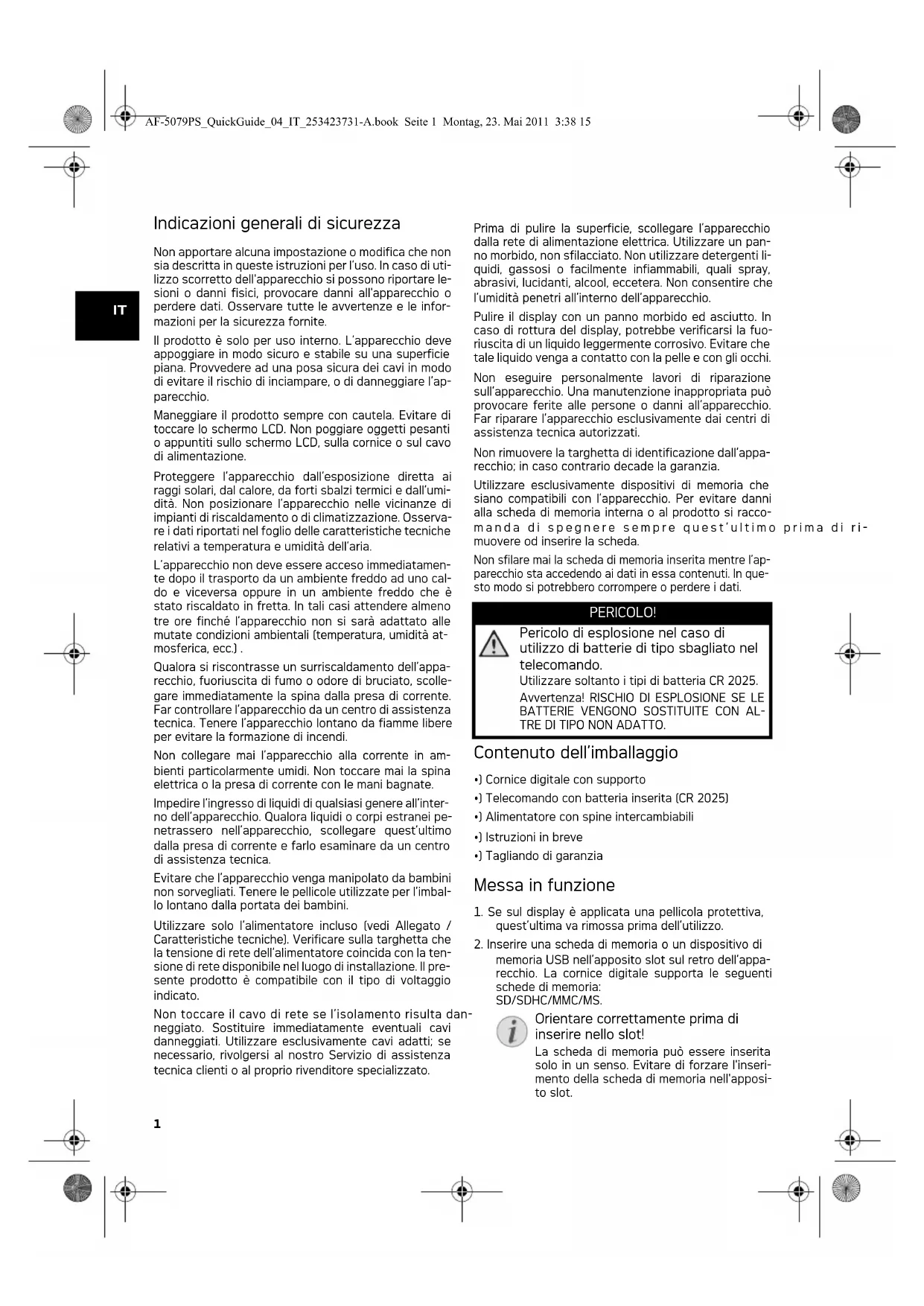 - Indicazioni generali di sicurezza Introduzione 2 Non apportare alcuna impostazione o modifica che non sia descritta in queste istruzioni per l’uso. In caso di uti- lizzo scorretto dell'apparecchio si possono riportare le- sioni o danni fisici, provocare danni all'apparecchio o perdere dati. Osservare tutte le avvertenze e le infor- mazioni per la sicurezza fornite. Il prodot to è solo per uso interno. Il prodotto è solo per uso interno. L’apparecchio deve appoggiare in modo sicuro e stabile su una superficie piana. Provvedere ad una posa sicura dei cavi in modo di evitare il rischio di inciampare, o di danneggiare l’ap- parecchio. Schermo TFT LCD Maneggiare il prodotto sempre con cautela. Evitare di toccare lo schermo LCD. Non poggiare oggetti pesanti o appuntiti sullo schermo LCD, sulla cornice o sul cavo di alimentazione. Proteggere l’apparecchio dall’esposizione diretta ai raggi solari Proteggere l’apparecchio dall’esposizione diretta ai raggi solari, dal calore, da forti sbalzi termici e dall’umi- dità. Non posizionare l’apparecchio nelle vicinanze di impianti di riscaldamento o di climatizzazione. Osserva- re i dati riportati nel foglio delle caratteristiche tecniche relativi a temperatura e umidità dell’aria. Non attiv are l'appar ecchio immediatame nte dopo il trasport o L’apparecchio non deve essere acceso immediatamen- te dopo il trasporto da un ambiente freddo ad uno cal- do e viceversa oppure in un ambiente freddo che è stato riscaldato in fretta. In tali casi attendere almeno tre ore finché l’apparecchio non si sarà adattato alle mutate condizioni ambientali (temperatura, umidità at- mosferica, ecc.) . Qualora si riscontrasse un surriscaldamento dell’apparecchio o fuoriuscita di fumo Qualora si riscontrasse un surriscaldamento dell’appa- recchio, fuoriuscita di fumo o odore di bruciato, scolle- gare immediatamente la spina dalla presa di corrente. Far controllare l’apparecchio da un centro di assistenza tecnica. Tenere l’apparecchio lontano da fiamme libere per evitare la formazione di incendi. Non coll egare mai l’apparec chio alla corrente in ambienti particol armente u midi. Non collegare mai l’apparecchio alla corrente in am- bienti particolarmente umidi. Non toccare mai la spina elettrica o la presa di corrente con le mani bagnate. Impedire l’ingresso di liquidi di qualsiasi ge nere all’interno de ll’apparecchio. Impedire l’ingresso di liquidi di qualsiasi genere all’inter- no dell’apparecchio. Qualora liquidi o corpi estranei pe- netrassero nell’apparecchio, scollegare quest’ultimo dalla presa di corrente e farlo esaminare da un centro di assistenza tecnica. Evitare che l’a pparecch io venga manipolato da bambini non sorvegliati. Evitare che l’apparecchio venga manipolato da bambini non sorvegliati. Tenere le pellicole utilizzate per l’imbal- lo lontano dalla portata dei bambini. Utilizzare solo l’al imentatore incluso Utilizzare solo l’alimentatore incluso (vedi Allegato / Caratteristiche tecniche). Verificare sulla targhetta che la tensione di rete dell’alimentatore coincida con la ten- sione di rete disponibile nel luogo di installazione. Il pre- sente prodotto è compatibile con il tipo di voltaggio indicato. Non toccare il cavo di rete se l’isolamento ri sulta dann eggiato. Non toccare il cavo di rete se l’isolamento risulta dan- neggiato. Sostituire immediatamente eventuali cavi danneggiati. Utilizzare esclusivamente cavi adatti; se necessario, rivolgersi al nostro Servizio di assistenza tecnica clienti o al proprio rivenditore specializzato. Prima di pulire la s uperficie , scollegare l’apparecchio dalla rete di alimentazione elettrica. Prima di pulire la superficie, scollegare l’apparecchio dalla rete di alimentazione elettrica. Utilizzare un pan- no morbido, non sfilacciato. Non utilizzare detergenti li- quidi, gassosi o facilmente infiammabili, quali spray, abrasivi, lucidanti, alcool, eccetera. Non consentire che l’umidità penetri all’interno dell’apparecchio. Pulire il display con un panno morbido ed asciutto. Pulire il display con un panno morbido ed asciutto. In caso di rottura del display, potrebbe verificarsi la fuo- riuscita di un liquido leggermente corrosivo. Evitare che tale liquido venga a contatto con la pelle e con gli occhi. Riparazioni Non eseguire personalmente lavori di riparazione sull’apparecchio. Una manutenzione inappropriata può provocare ferite alle persone o danni all’apparecchio. Far riparare l’apparecchio esclusivamente dai centri di assistenza tecnica autorizzati. Non rimuovere la targhetta di identificazione dall’appa- recchio; in caso contrario decade la garanzia. Dispositivi di memoria per fotografie Utilizzare esclusivamente dispositivi di memoria che siano compatibili con l’apparecchio. Per evitare danni alla scheda di memoria interna o al prodotto si racco- manda di spegnere sempre quest’ultimo prima di ri- muovere od inserire la scheda. Non sfilare mai la scheda di memoria inserita mentre l’ap- parecchio sta accedendo ai dati in essa contenuti. In que- sto modo si potrebbero corrompere o perdere i dati. Pericolo di esplosione nel caso di ut ilizzo di batterie di tipo sbagliato n el teleco mando. Contenuto dell’imballaggio