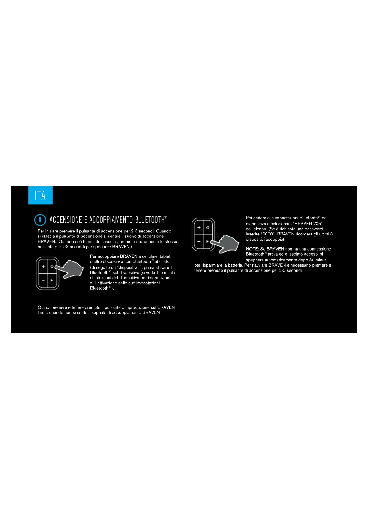 Per iniziare premere il pulsante di accensione per 2-3 secondi. Quando si rilascia il pulsante di accensione si sentire il suono di accensione BRAVEN. (Quando si è terminato l’ascolto, premere nuovamente lo stesso pulsante per 2-3 secondi per spegnere BRAVEN.) Per accoppiare BRAVEN a cellulare, tablet o altro dispositivo con Bluetooth