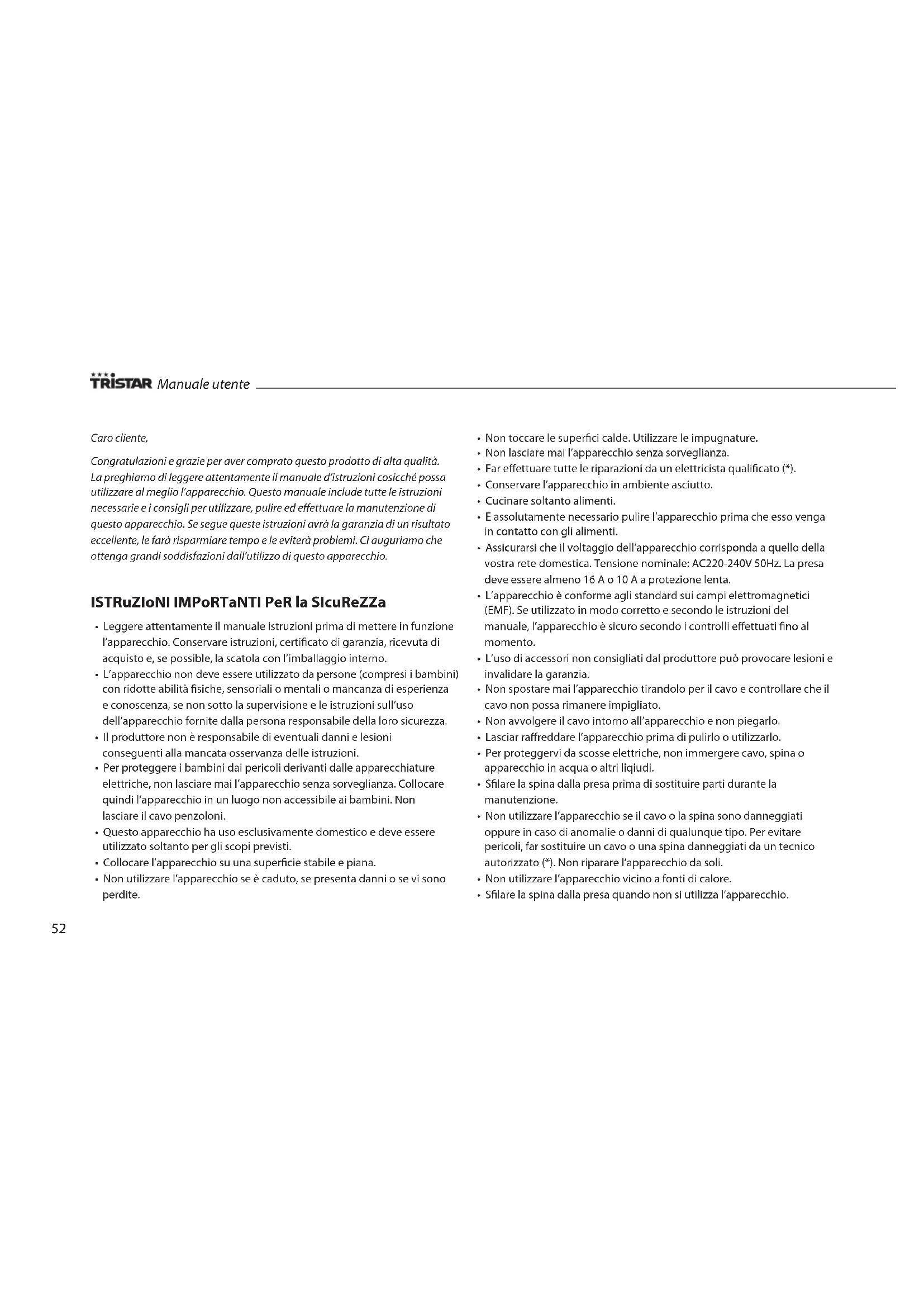 - Tristar non è responsabile di danni materiali o lesioni personali causate da un uso improprio o da un mancato rispetto delle istruzioni di sicurezza.