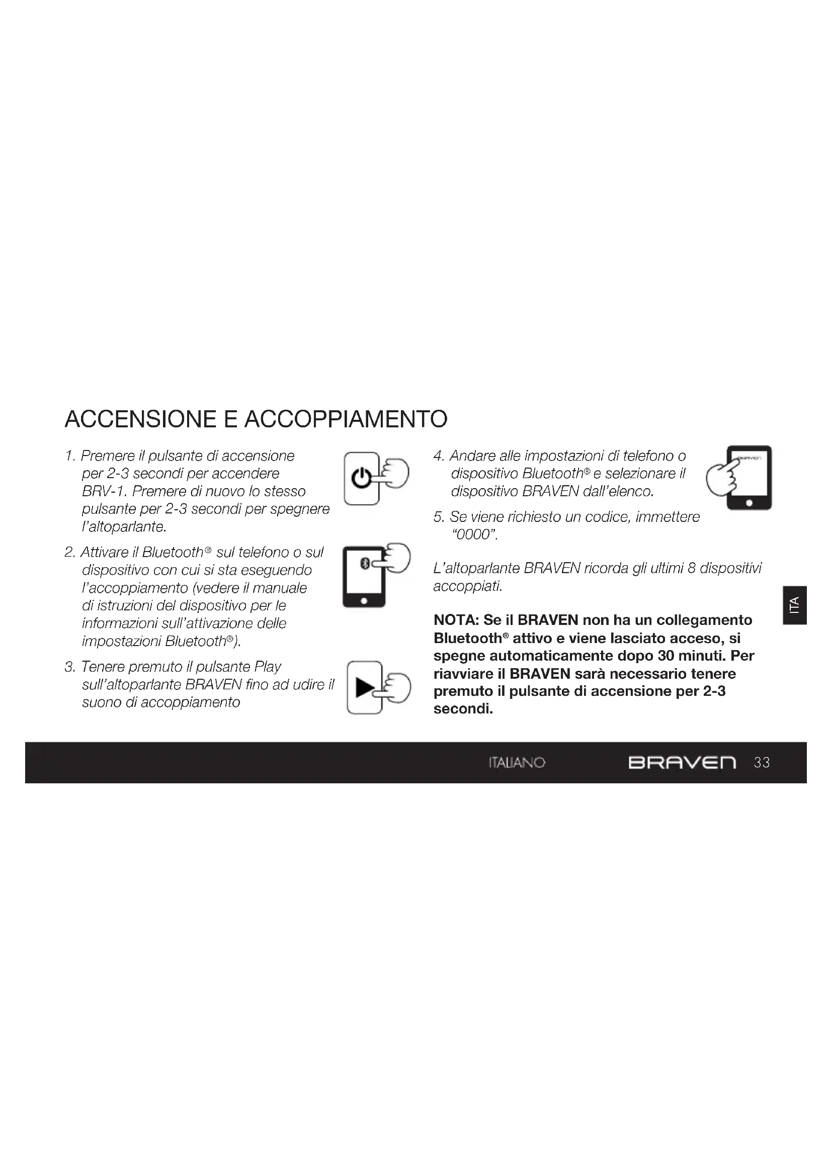“0000”. L’altoparlante BRAVEN ricorda gli ultimi 8 dispositivi accoppiati. NOTA: Se il BRAVEN non ha un collegamento Bluetooth