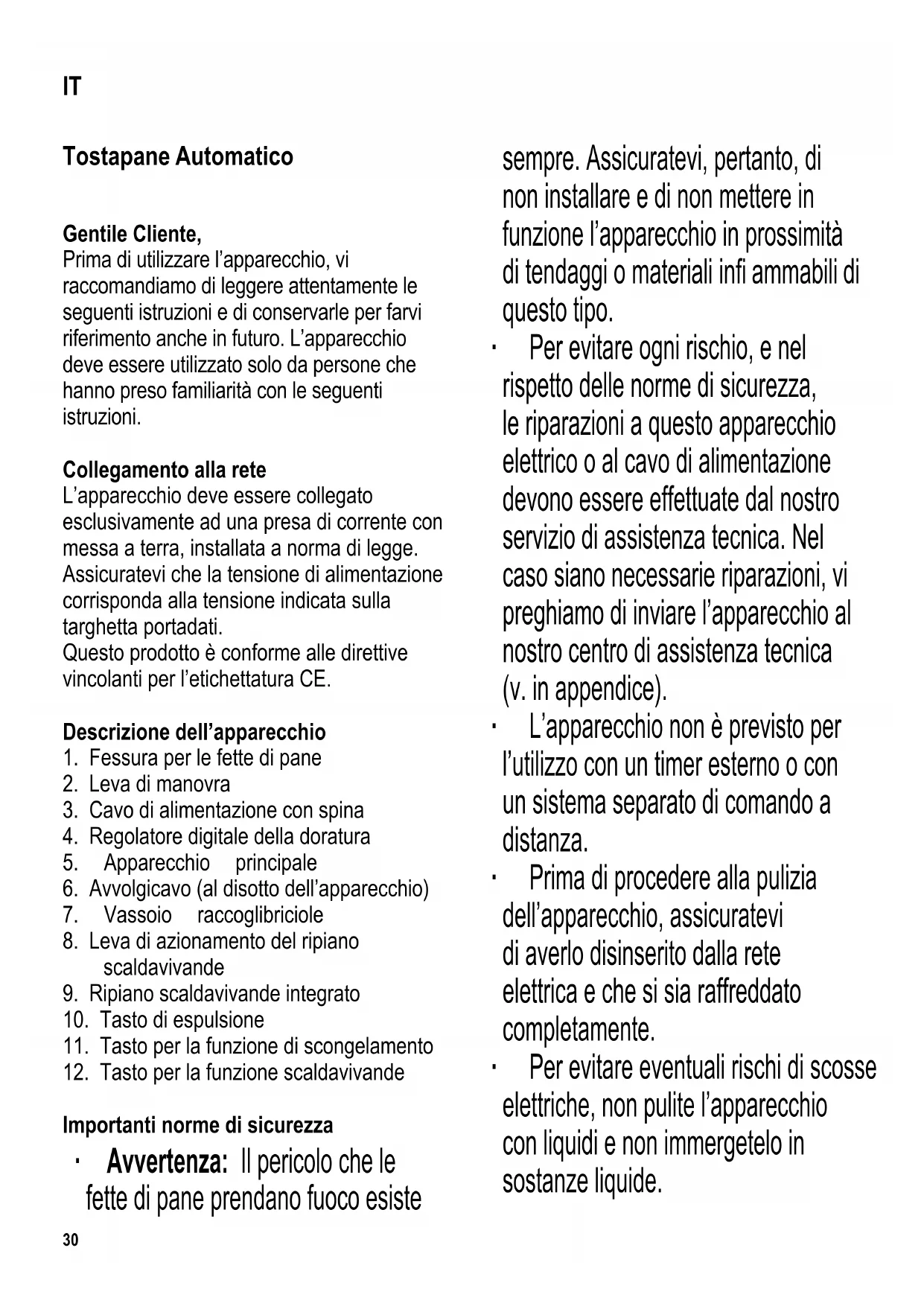 Importanti norme di sicurezza ∙ Avvertenza: Il pericolo che le fette di pane prendano fuoco esiste sempre. Assicuratevi, pertanto, di non installare e di non mettere in funzione l’apparecchio in prossimità di tendaggi o materiali infi ammabili di questo tipo. ∙ Per evitare ogni rischio, e nel rispetto delle norme di sicurezza, le riparazioni a questo apparecchio elettrico o al cavo di alimentazione devono essere effettuate dal nostro servizio di assistenza tecnica. Nel caso siano necessarie riparazioni, vi preghiamo di inviare l’apparecchio al nostro centro di assistenza tecnica (v. in appendice). ∙ L’apparecchio non è previsto per l’utilizzo con un timer esterno o con un sistema separato di comando a distanza. ∙ Prima di procedere alla pulizia dell’apparecchio, assicuratevi di averlo disinserito dalla rete elettrica e che si sia raffreddato completamente. ∙ Per evitare eventuali rischi di scosse elettriche, non pulite l’apparecchio con liquidi e non immergetelo in sostanze liquide. IT31 ∙ Per pulire l’esterno dell’apparecchio, basterà strofi narlo con un panno leggermente umido. ∙ Per rimuovere le briciole, tirate lateralmente il vassoio raccoglibriciole e vuotatelo. Ma ricordatevi di rimettere in sede il vassoio raccoglibriciole prima di riutilizzare l’apparecchio. ∙ Questo apparecchio è studiato per il solo uso domestico o per impieghi simili, come per esempio - in cucine per il personale, negozi, uffi ci e altri ambienti simili di lavoro, - in aziende agricole, - da clienti di alberghi, motel e sistemazioni simili, - da clienti di pensioni “bed-and- breakfast” (letto & colazione). ∙ Il presente apparecchio può essere usato da bambini (di almeno 8 anni di età) e da persone con ridotte capacità fi siche, sensoriali o mentali, o persone senza particolari esperienze o conoscenze, purché siano sotto sorveglianza o siano state date loro istruzioni sull’uso dell’apparecchio e comprendano pienamente i rischi e le precauzioni di sicurezza che l’apparecchio comporta. ∙ Ai bambini non deve essere consentito di giocare con l’apparecchio. ∙ Ai bambini non deve essere consentito di effettuare operazioni di pulizia o di manutenzione sull’apparecchio a meno che non siano supervisionati da un adulto e siano comunque più grandi di 8 anni di età. ∙ L’apparecchio e il cavo di alimentazione devono essere tenuti sempre fuori della portata di bambini di età inferiore agli 8 anni. ∙ Avvertenza: Tutto il materiale di imballaggio deve essere tenuto fuori della portata dei bambini a causa del rischio potenziale esistente, per esempio di soffocamento. ∙ Sistemate sempre l’apparecchio su una superfi cie piana e termoresistente. ∙ Per evitare danni all’apparecchio, non ponetelo sopra o vicino a superfi ci calde o a fi amme libere come per esempio piastre di cottura elettriche o a gas. ∙ Attenzione: Quando l’apparecchio è in funzione, le pareti esterne dell’unità centrale diventano molto calde. Il contatto con gli elementi caldi potrebbe causare delle scottature. ∙ Prima di ogni utilizzo dell’apparecchio,32 controllate attentamente che l’apparecchio e gli accessori inseriti non presentino tracce di deterioramento. Se per esempio fosse caduto battendo su una superfi cie dura, o se è stata usata una forza eccessiva nel tirare il cavo di alimentazione, l’apparecchio non va più usato: danni anche invisibili ad occhio nudo potrebbero comportare conseguenze negative sulla sicurezza nel funzionamento dell’apparecchio. ∙ Evitate che il cavo di alimentazione tocchi superfi ci calde. ∙ Non lasciate pendere liberamente il cavo di alimentazione. ∙ Non lasciate l’apparecchio senza sorveglianza quando è in funzione. ∙ Badate a non coprire la fessura per il pane mentre l’apparecchio è in funzione. ∙ Non tentate di togliere il pane dal tostapane con le dita né di inserire altri oggetti (es. coltelli, forchette) nella fessura per il pane. Gli elementi riscaldanti sono sotto tensione. ∙ Disinserite sempre la spina dalla presa - dopo l’uso, - in caso di cattivo funzionamento, - prima di pulire l’apparecchio. ∙ Per disinserire la spina dalla presa di corrente, non tirate mai il cavo di alimentazione ma afferrate direttamente la spina. ∙ Nessuna responsabilità verrà assunta in caso di danni risultanti da un uso errato o dalla non conformità alle istruzioni. Funzionamento Dati generali ∙ Attenzione: La leva di manovra si blocca solamente quando la spina è inserita. ∙ Non inserite delle fette di pane troppo spesse o troppo grandi, perché rischiano di rimanere incastrate all’interno del tostapane. Lo spessore delle fette da tostare non dovrebbe superare i 14 mm. ∙ Disinserite sempre la spina dalla presa di corrente quando incontrate dei problemi, in caso di cattivo funzionamento e prima di ogni pulizia. ∙ Togliete la fetta eventualmente incastrata all’interno del tostapane aiutandovi con un bastoncino in legno non appuntito (p. es. il manico di un pennello). Non toccate mai gli elementi riscaldanti in metallo. Prima di adoperare l’apparecchio per la prima volta ∙ Pulite accuratamente l’apparecchio (v. il paragrafo Manutenzione e pulizia). ∙ Accendete il tostapane e eseguite almeno cinque cicli di tostatura al massimo dell’impostazione di doratura, ma senza aggiungere pane. ∙ Lasciate all’apparecchio il tempo di raffreddarsi tra un ciclo di tostatura e l’altro. ∙ Potrebbe succedere che alla prima accensione l’apparecchio esali un leggero odore e un po’ di fumo, questi fenomeni scompariranno dopo un breve periodo. È bene però assicurare una buona aerazione lasciando aperte porte e fi nestre. Spegnimento automatico Questo apparecchio è dotato di un dispositivo per lo spegnimento automatico. Se la fetta di pane si incastra e non esce fuori alla fi ne del ciclo di tostatura, il tostapane si spegne automaticamente.33 In questo caso, disinserite l’apparecchio dalla rete elettri