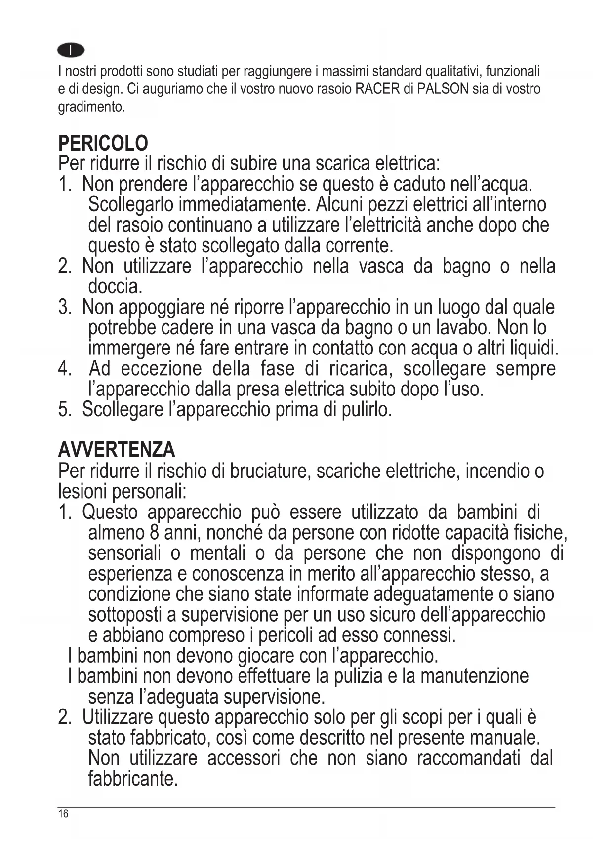 I nostri prodotti sono studiati per raggiungere i massimi standard qualitativi, funzionali e di design. Ci auguriamo che il vostro nuovo rasoio RACER di PALSON sia di vostro gradimento. PEriCOLO Per ridurre il rischio di subire una scarica elettrica: