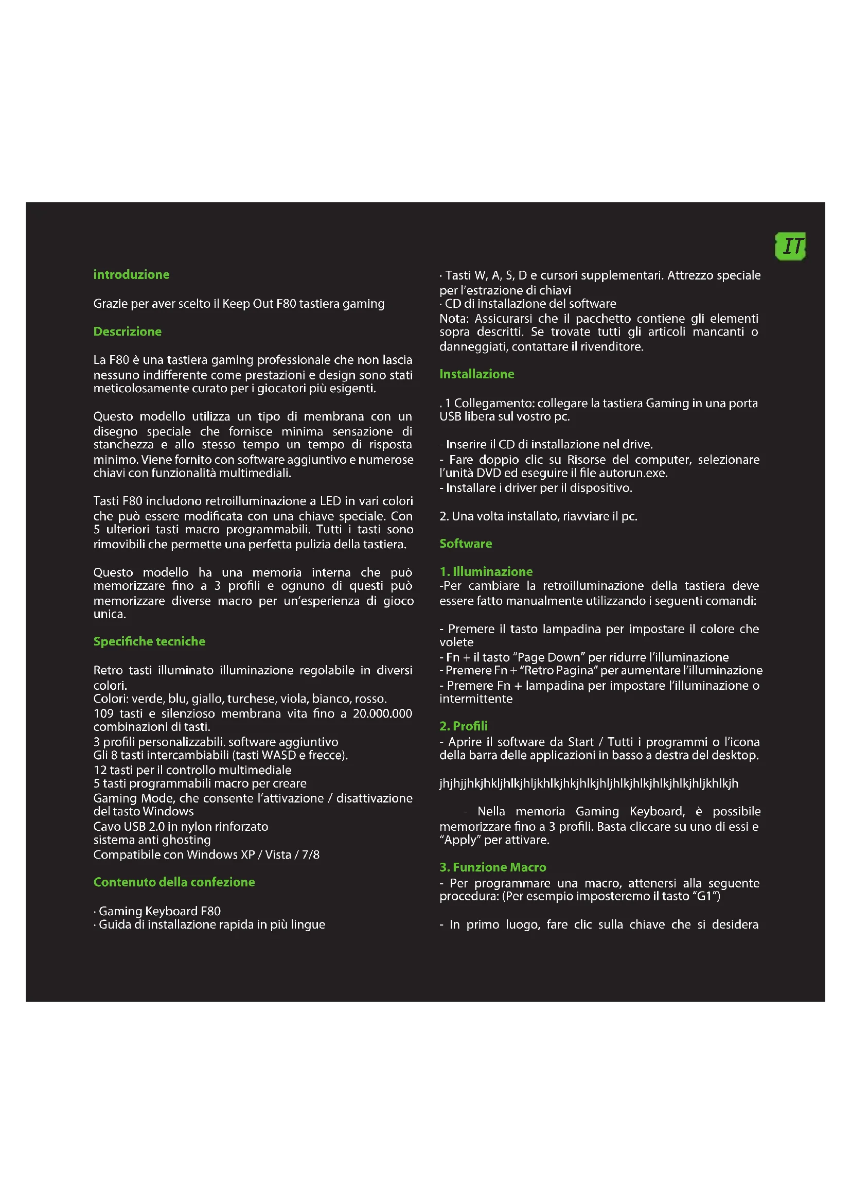 Vissza tudja állítani alapértelmezett kattintson a “Restore Default” gombot a szoftveres billentyűzet. Műszaki támogatás Kérjük, további információkért telepítésével és beállításával ez a termék megy honlapunkon www.keep-out.eu vagy írjon egy e-mailt a következő címre: support@keep-out.euIT introduzione Grazie per aver scelto il Keep Out F80 tastiera gaming Descrizione La F80 è una tastiera gaming professionale che non lascia nessuno indierente come prestazioni e design sono stati meticolosamente curato per i giocatori più esigenti. Questo modello utilizza un tipo di membrana con un disegno speciale che fornisce minima sensazione di stanchezza e allo stesso tempo un tempo di risposta minimo. Viene fornito con software aggiuntivo e numerose chiavi con funzionalità multimediali. Tasti F80 includono retroilluminazione a LED in vari colori che può essere modicata con una chiave speciale. Con 5 ulteriori tasti macro programmabili. Tutti i tasti sono rimovibili che permette una perfetta pulizia della tastiera. Questo modello ha una memoria interna che può memorizzare no a 3 proli e ognuno di questi può memorizzare diverse macro per un’esperienza di gioco unica. Speciche tecniche Retro tasti illuminato illuminazione regolabile in diversi colori. Colori: verde, blu, giallo, turchese, viola, bianco, rosso. 109 tasti e silenzioso membrana vita no a 20.000.000 combinazioni di tasti. 3 proli personalizzabili. software aggiuntivo Gli 8 tasti intercambiabili (tasti WASD e frecce). 12 tasti per il controllo multimediale 5 tasti programmabili macro per creare Gaming Mode, che consente l’attivazione / disattivazione del tasto Windows Cavo USB 2.0 in nylon rinforzato sistema anti ghosting Compatibile con Windows XP / Vista / 7/8 Contenuto della confezione