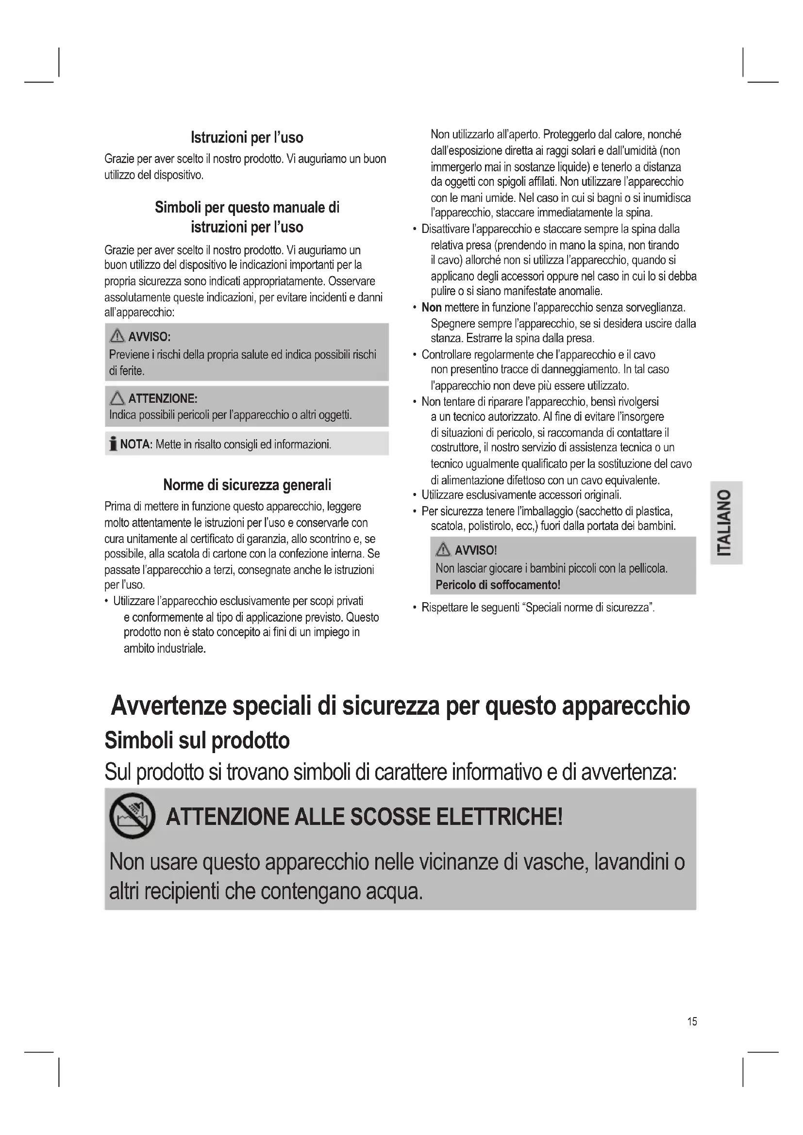 - Utilizzare l’apparecchio esclusivamente per scopi privati e conformemente al tipo di applicazione previsto. Questo prodotto non è stato concepito ai ni di un impiego in ambito industriale. Avvertenze speciali di sicurezza per questo apparecchio Simboli sul prodotto Sul prodotto si trovano simboli di carattere informativo e di avvertenza: ATTENZIONE ALLE SCOSSE ELETTRICHE! Non usare questo apparecchio nelle vicinanze di vasche, lavandini o altri recipienti che contengano acqua.16 AVVISO: