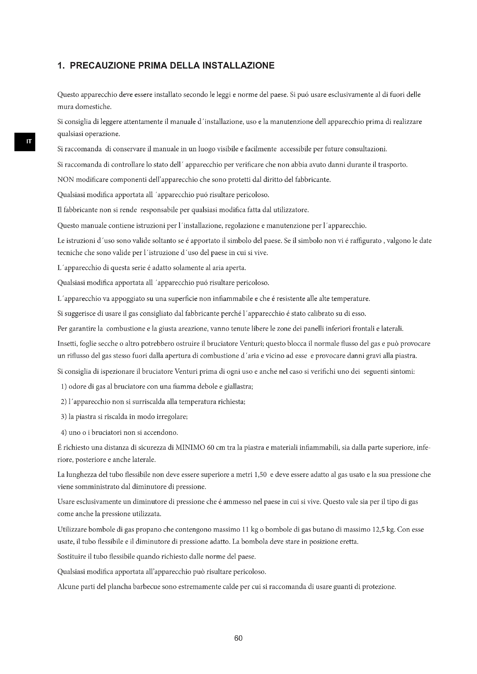 É richiesto una distanza di sicurezza di MINIMO 60 cm tra la piastra e materiali inammabili, sia dalla parte superiore, infe- riore, posteriore e anche laterale. La lunghezza del tubo essibile non deve essere superiore a metri 1,50 e deve essere adatto al gas usato e la sua pressione che viene somministrato dal diminutore di pressione. Usare esclusivamente un diminutore di pressione che é ammesso nel paese in cui si vive. Questo vale sia per il tipo di gas come anche la pressione utilizzata. Utilizzare bombole di gas propano che contengono massimo 11 kg o bombole di gas butano di massimo 12,5 kg. Con esse usate, il tubo essibile e il diminutore di pressione adatto. La bombola deve stare in posizione eretta. Sostituire il tubo essibile quando richiesto dalle norme del paese. Qualsiasi modica apportata all’apparecchio può risultare pericoloso. Alcune parti del plancha barbecue sono estremamente calde per cui si raccomanda di usare guanti di protezione. IT61