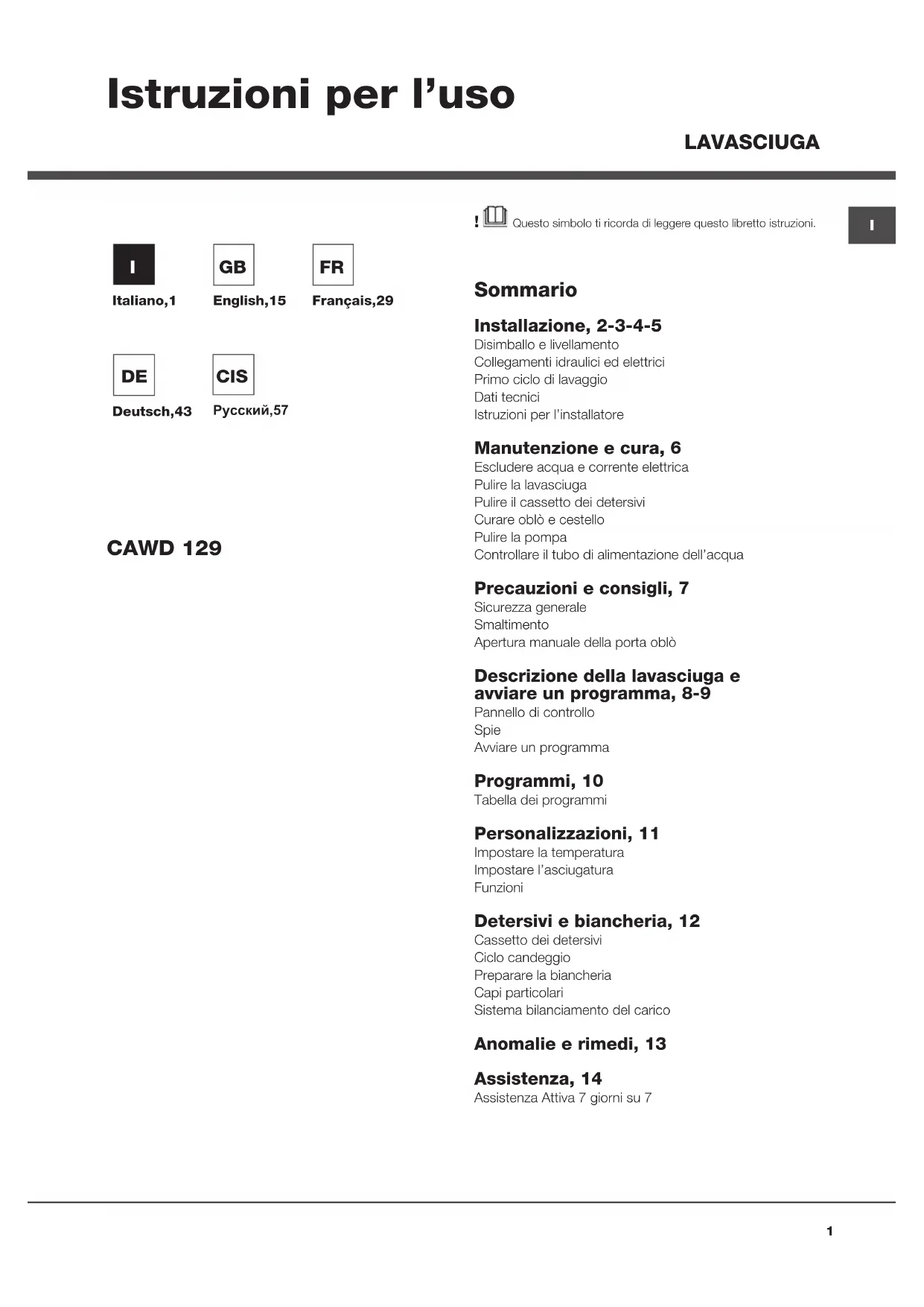 ! Questo simbolo ti ricorda di leggere questo libretto istruzioni. Sommario Installazione, 2-3-4-5 Disimballo e livellamentoCollegamenti idraulici ed elettriciPrimo ciclo di lavaggioDati tecniciIstruzioni per l’installatore Manutenzione e cura, 6 Escludere acqua e corrente elettricaPulire la lavasciugaPulire il cassetto dei detersiviCurare oblò e cestelloPulire la pompaControllare il tubo di alimentazione dell’acqua Precauzioni e consigli, 7 Sicurezza generaleSmaltimentoApertura manuale della porta oblò Descrizione della lavasciuga e avviare un programma, 8-9 Pannello di controllo Spie Avviare un programma Programmi, 10 Tabella dei programmi Personalizzazioni, 11 Impostare la temperaturaImpostare l’asciugaturaFunzioni Detersivi e biancheria, 12 Cassetto dei detersiviCiclo candeggioPreparare la biancheriaCapi particolariSistema bilanciamento del carico Anomalie e rimedi, 13 Assistenza, 14 Assistenza Attiva 7 giorni su 7 LAVASCIUGA CAWD 129 Istruzioni per l’uso Italiano,1 Deutsch,43 English,15 Français,29 Русский,57 CIS2