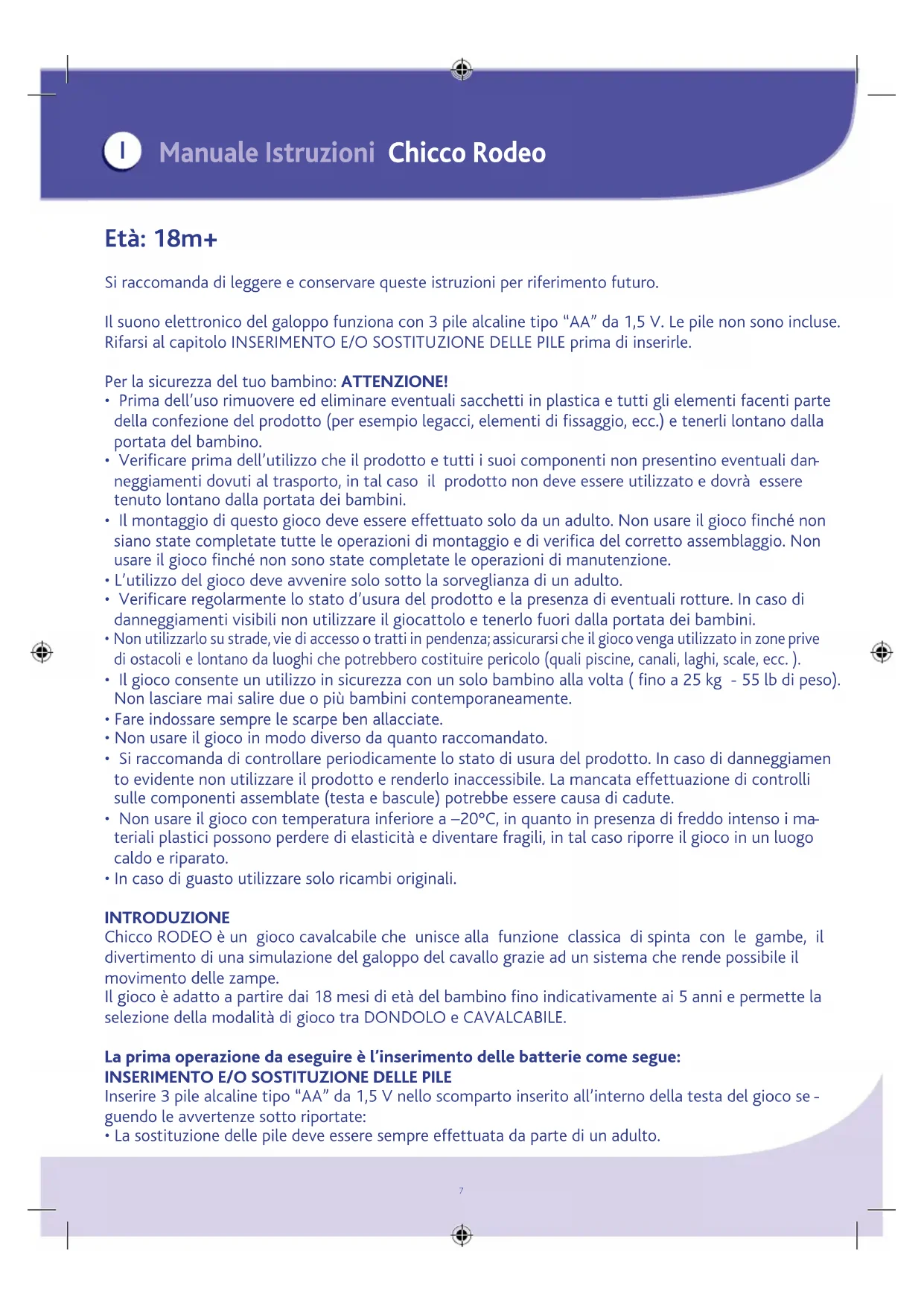 - La sostituzione delle pile deve essere sempre effettuata da parte di un adulto. Manuale Istruzioni Chicco Rodeo