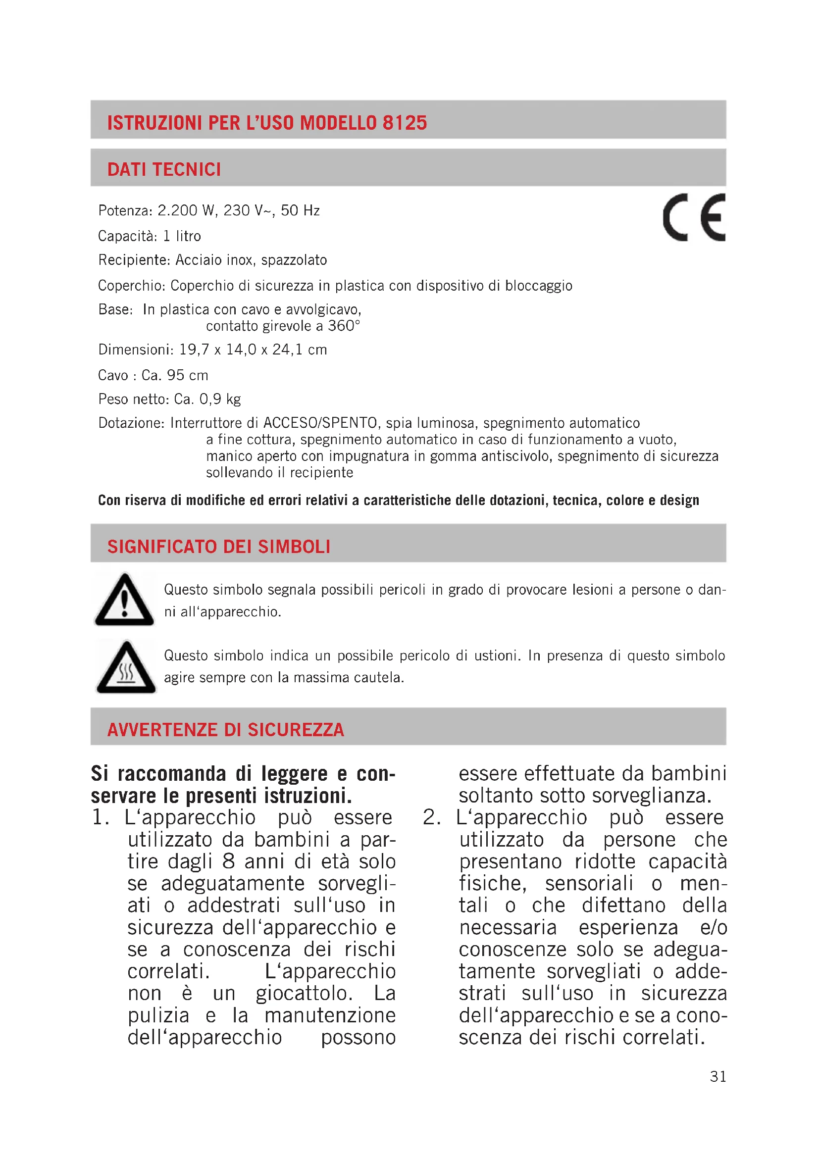 ati o addestrati sull‘uso in sicurezza dell‘apparecchio e se a conoscenza dei rischi correlati. L‘apparecchio non è un giocattolo. La pulizia e la manutenzione dell‘apparecchio possono essere effettuate da bambini soltanto sotto sorveglianza.