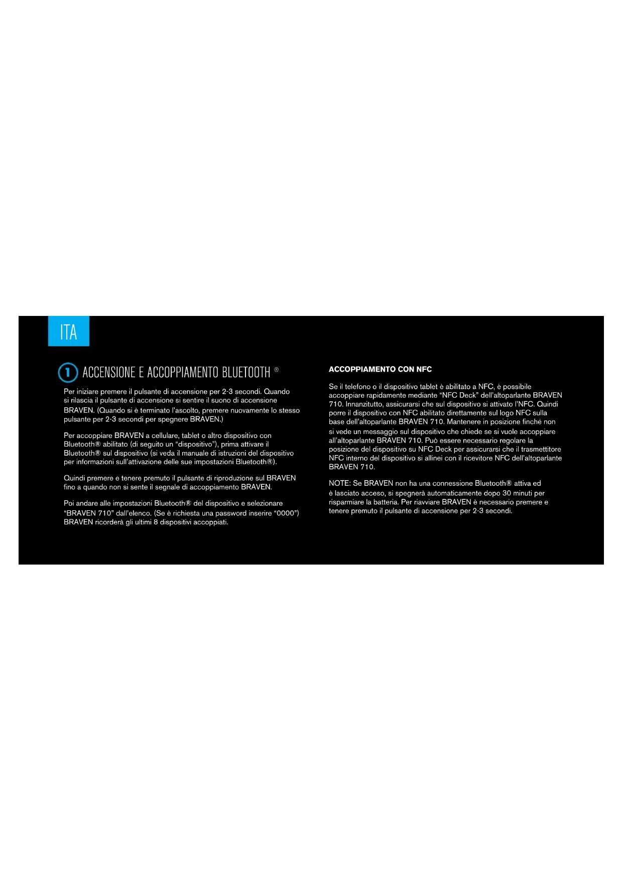 porre il dispositivo con NFC abilitato direttamente sul logo NFC sulla base dell’altoparlante BRAVEN 710. Mantenere in posizione finché non si vede un messaggio sul dispositivo che chiede se si vuole accoppiare all’altoparlante BRAVEN 710. Può essere necessario regolare la posizione del dispositivo su NFC Deck per assicurarsi che il trasmettitore NFC interno del dispositivo si allinei con il ricevitore NFC dell’altoparlante BRAVEN 710. NOTE: Se BRAVEN non ha una connessione Bluetooth® attiva ed è lasciato acceso, si spegnerà automaticamente dopo 30 minuti per risparmiare la batteria. Per riavviare BRAVEN è necessario premere e tenere premuto il pulsante di accensione per 2-3 secondi. 1ITA