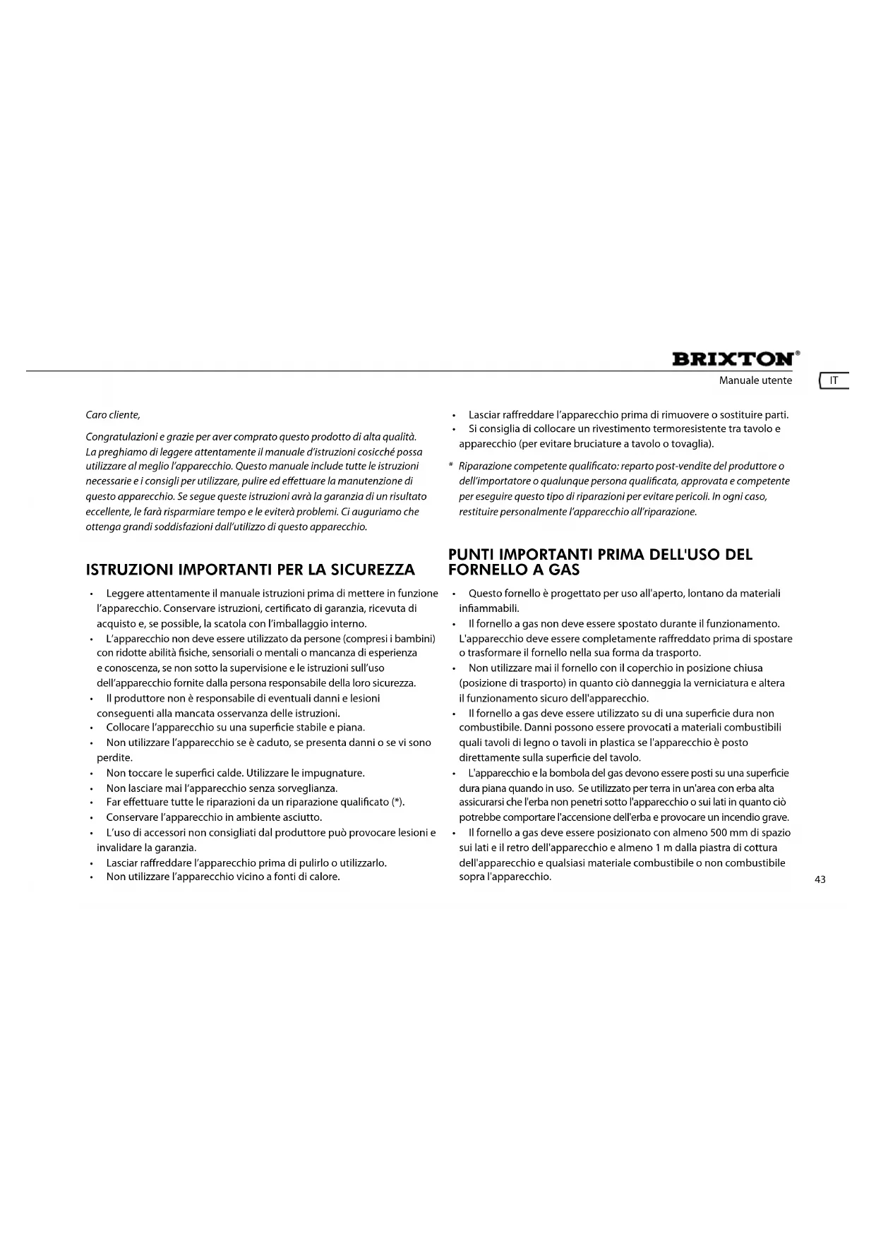 - Riparazione competente qualicato: reparto post-vendite del produttore o dell’importatore o qualunque persona qualicata, approvata e competente per eseguire questo tipo di riparazioni per evitare pericoli. In ogni caso, restituire personalmente l’apparecchio all’riparazione. punti importanti prima dell'uso del fornello a Gas