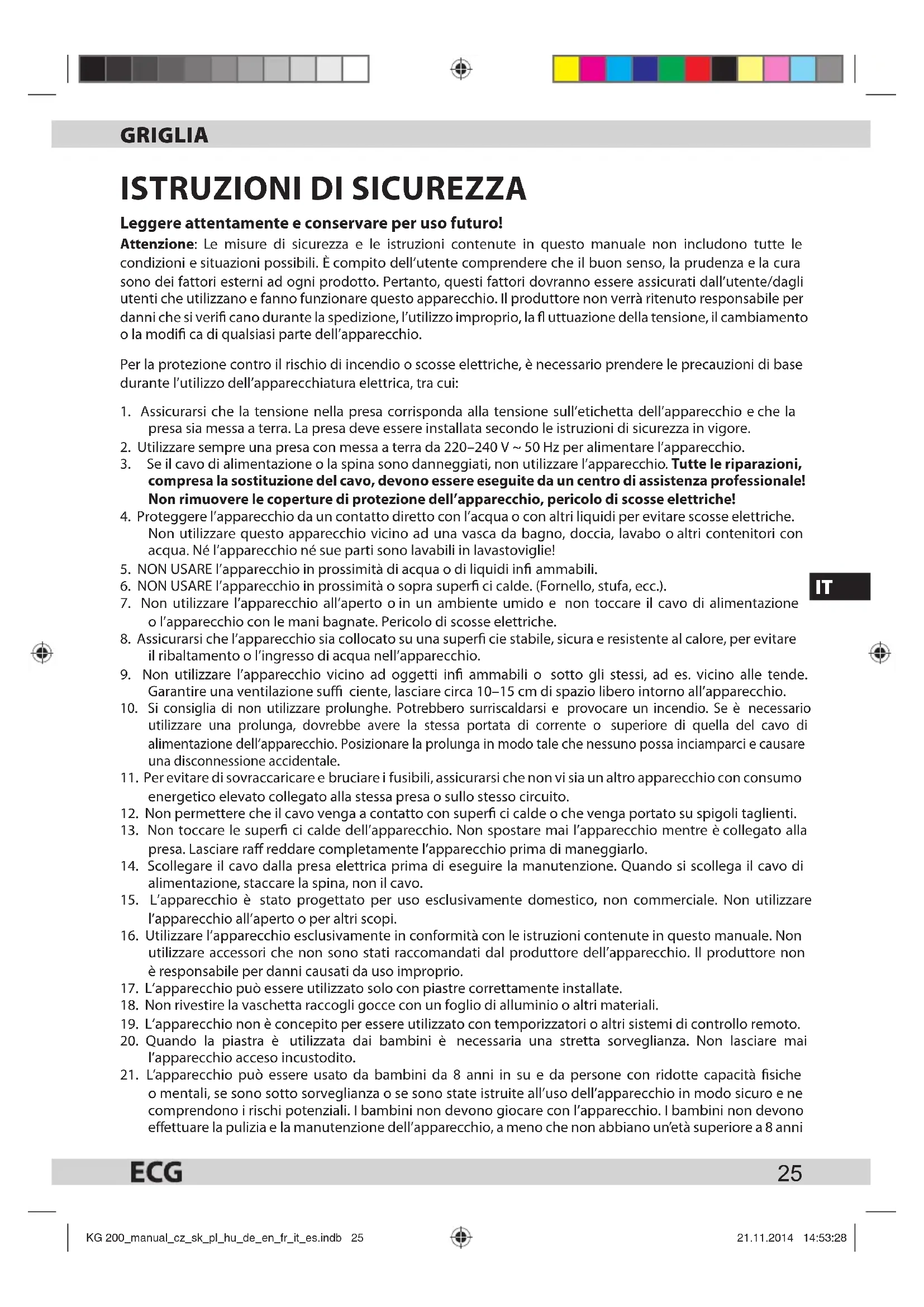 omentali, se sono sotto sorveglianza ose sono state istruite all’uso dell’apparecchio in modo sicuro ene comprendono irischi potenziali. Ibambini non devono giocare con l’apparecchio. Ibambini non devono e ettuare la pulizia ela manutenzione dell’apparecchio, ameno che non abbiano un’età superiore a8 anni KG 200_manual_cz_sk_pl_hu_de_en_fr_it_es.indb 25 21.11.2014 14:53:2826