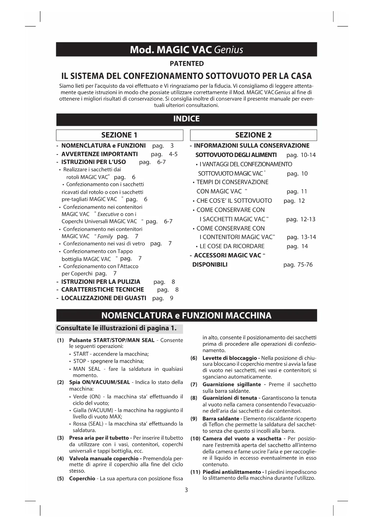 DISPONIBILI pag. 75-76 NOMENCLATURA e FUNZIONI MACCHINA (1) Pulsante START/STOP/MAN SEAL - Consente le seguenti operazioni: • START - accendere la macchina; • STOP - spegnere la macchina; • MAN SEAL - fare la saldatura in qualsiasi momento.(2) Spia ON/VACUUM/SEAL - Indica lo stato della macchina: • Verde (ON) - la macchina sta’ effettuando il ciclo del vuoto; • Gialla (VACUUM) - la macchina ha raggiunto il livello di vuoto MAX; • Rossa (SEAL) - la macchina sta’ effettuando la saldatura.(3) Presa aria per il tubetto - Per inserire il tubetto da utilizzare con i vasi, contenitori, coperchi universali e tappi bottiglia, ecc. (4) Valvola manuale coperchio - Premendola per- mette di aprire il coperchio alla fine del ciclo stesso. (5) Coperchio - La sua apertura con posizione fissa Consultate le illustrazioni di pagina 1. in alto, consente il posizionamento dei sacchetti prima di procedere alle operazioni di confezio-namento. (6) Levette di bloccaggio - Nella posizione di chiu- sura bloccano il coperchio mentre si avvia la fase di vuoto nei sacchetti, nei vasi e contenitori; si sganciano automaticamente.(7) Guarnizione sigillante - Preme il sacchetto sulla barra saldante.(8) Guarnizioni di tenuta - Garantiscono la tenuta al vuoto nella camera consentendo l’evacuazio-ne dell’aria dai sacchetti e dai contenitori.(9) Barra saldante - Elemento riscaldante ricoperto di Teflon che permette la saldatura del sacchet-to senza che questo si incolli alla barra.(10) Camera del vuoto a vaschetta - Per posizio-nare l’estremità aperta del sacchetto all’interno della camera e farne uscire l’aria e per raccoglie-re il liquido in eccesso eventualmente in esso contenuto.(11) Piedini antislittamento - I piedini impediscono lo slittamento della macchina durante l’utilizzo. PATENTED INDICE SEZIONE 1 SEZIONE 24 AVVERTENZE IMPORTANTI Il costruttore compie ogni sforzo necessario affinché ogni pro- dotto sia dotato della più alta qualità e sicurezza, tuttavia come per ogni apparecchio elettrico, bisogna sempre osservare fondamen- tali norme di sicurezza per evitare di costituire pericolo per persone, animali e/o cose.