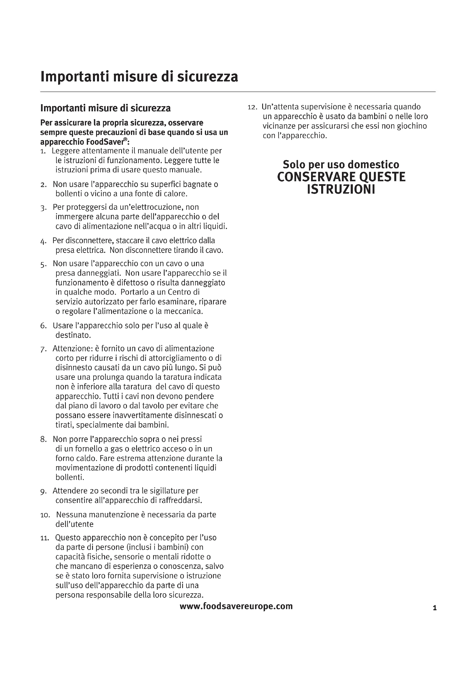 1. Leggere attentamente il manuale dell’utente per le istruzioni di funzionamento. Leggere tutte le istruzioni prima di usare questo manuale.2. Non usare l’apparecchio su superfici bagnate o bollenti o vicino a una fonte di calore.3. Per proteggersi da un’elettrocuzione, non immergere alcuna parte dell’apparecchio o del cavo di alimentazione nell’acqua o in altri liquidi.4. Per disconnettere, staccare il cavo elettrico dalla presa elettrica. Non disconnettere tirando il cavo. 5. Non usare l’apparecchio con un cavo o una presa danneggiati. Non usare l’apparecchio se il funzionamento è difettoso o risulta danneggiato in qualche modo. Portarlo a un Centro di servizio autorizzato per farlo esaminare, riparare o regolare l’alimentazione o la meccanica. 6. Usare l’apparecchio solo per l’uso al quale è destinato.7. Attenzione: è fornito un cavo di alimentazione corto per ridurre i rischi di attorcigliamento o di disinnesto causati da un cavo più lungo. Si può usare una prolunga quando la taratura indicata non è inferiore alla taratura del cavo di questo apparecchio. Tutti i cavi non devono pendere dal piano di lavoro o dal tavolo per evitare che possano essere inavvertitamente disinnescati o tirati, specialmente dai bambini.8. Non porre l’apparecchio sopra o nei pressi di un fornello a gas o elettrico acceso o in un forno caldo. Fare estrema attenzione durante la movimentazione di prodotti contenenti liquidi bollenti.9. Attendere 20 secondi tra le sigillature per consentire all’apparecchio di raffreddarsi.10. Nessuna manutenzione è necessaria da parte dell’utente11. Questo apparecchio non è concepito per l’uso da parte di persone (inclusi i bambini) con capacità fisiche, sensorie o mentali ridotte o che mancano di esperienza o conoscenza, salvo se è stato loro fornita supervisione o istruzione sull’uso dell’apparecchio da parte di una persona responsabile della loro sicurezza.12. Un’attenta supervisione è necessaria quando un apparecchio è usato da bambini o nelle loro vicinanze per assicurarsi che essi non giochino con l’apparecchio. Solo per uso domestico CONSERVARE QUESTE ISTRUZIONI Importanti misure di sicurezzawww.foodsavereurope.com