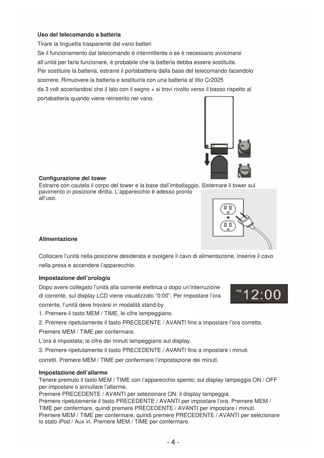 Alimentazione Collocare l’unità nella posizione desiderata e svolgere il cavo di alimentazione. Inserire il cavo nella presa e accendere l’apparecchio. Impostazione dell’orologio Dopo avere collegato l’unità alla corrente elettrica o dopo un’interruzione di corrente, sul display LCD viene visualizzato “0:00”. Per impostare l’ora corrente, l’unità deve trovarsi in modalità stand-by.