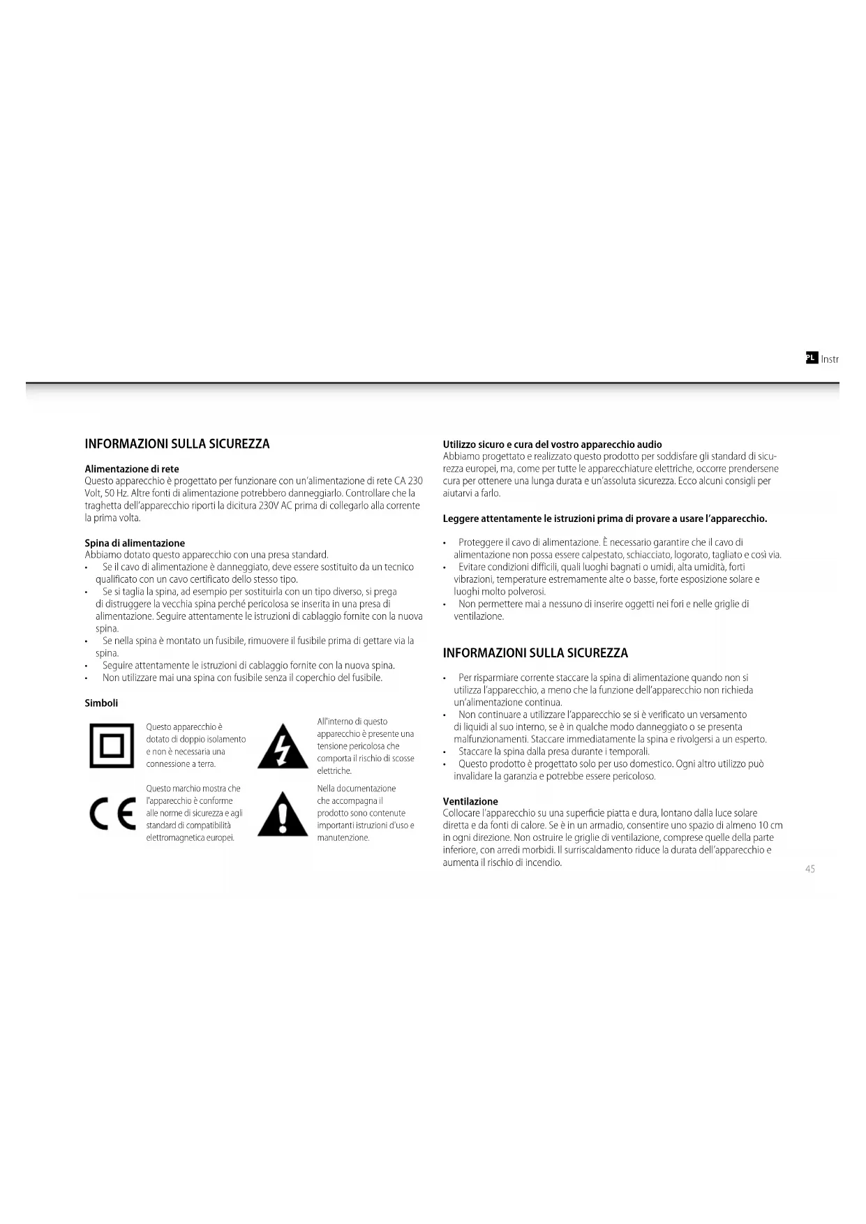 - Non utilizzare mai una spina con fusibile senza il coperchio del fusibile. Simboli Questo apparecchio è dotato di doppio isolamento e non è necessaria una connessione a terra. All'interno di questo apparecchio è presente una tensione pericolosa che comporta il rischio di scosse elettriche. Questo marchio mostra che l'apparecchio è conforme alle norme di sicurezza e agli standard di compatibilità elettromagnetica europei. Nella documentazione che accompagna il prodotto sono contenute importanti istruzioni d'uso e manutenzione. Utilizzo sicuro e cura del vostro apparecchio audio Abbiamo progettato e realizzato questo prodotto per soddisfare gli standard di sicu- rezza europei, ma, come per tutte le apparecchiature elettriche, occorre prendersene cura per ottenere una lunga durata e un’assoluta sicurezza. Ecco alcuni consigli per aiutarvi a farlo. Leggere attentamente le istruzioni prima di provare a usare l’apparecchio.