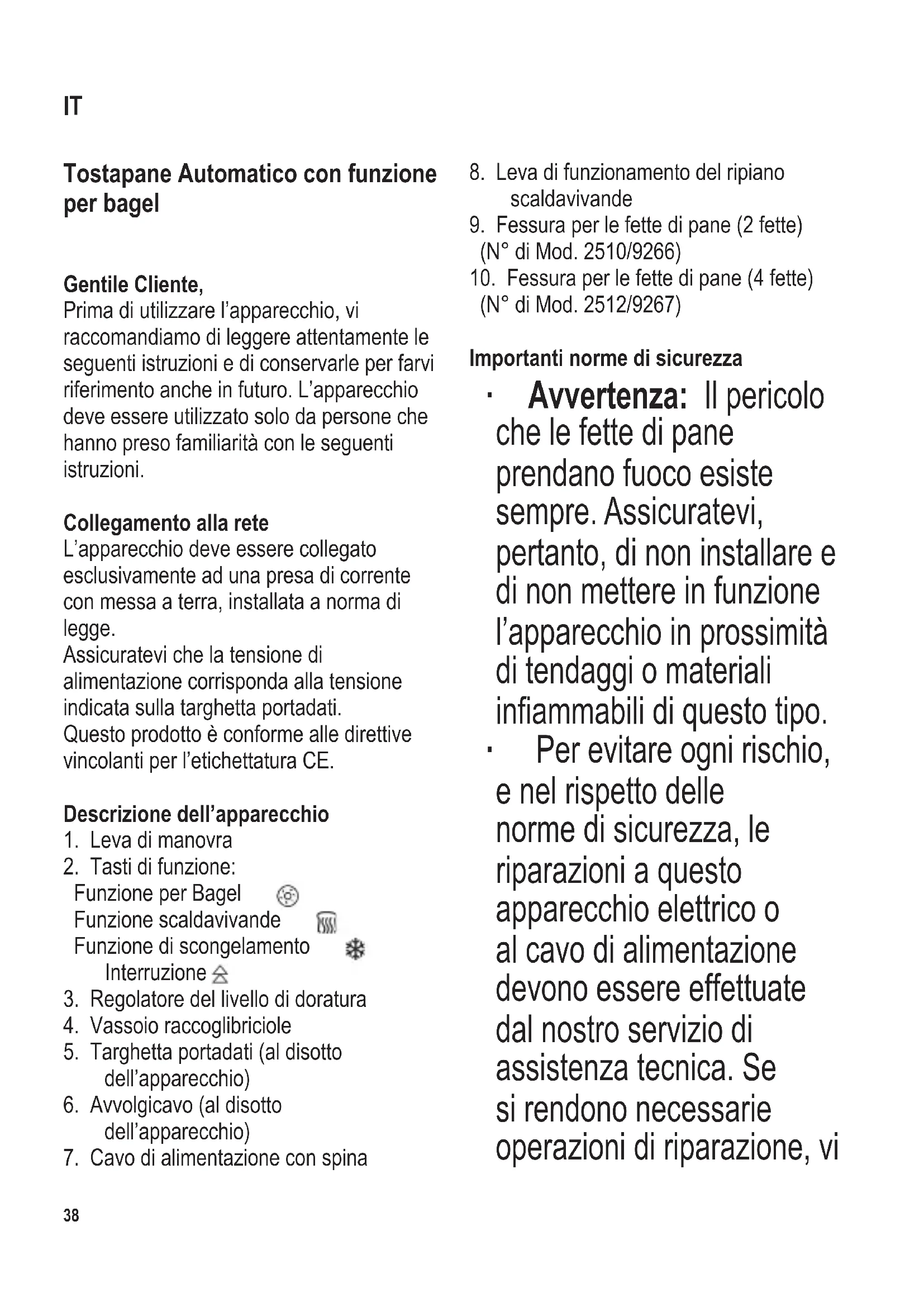 cavo di alimentazione. ∙ Non lasciate l’apparecchio senza sorveglianza quando è in funzione. ∙ Badate a non coprire la fessura per il pane mentre l’apparecchio è in funzione. ∙ Non mettete i panini direttamente sopra le fessure per le fette di pane. ∙ Avvertenza: Per evitare di danneggiare l’apparecchio, non provate a riscaldare le fettine di pane sul supporto per i panini. ∙ Non tentate di togliere il pane dal tostapane con le dita né di inserire altri oggetti (es. coltelli, forchette) nella fessura per il pane. Gli elementi riscaldanti sono sotto tensione. ∙ Disinserite sempre la spina dalla presa - dopo l’uso, - in caso di cattivo funzionamento, - prima di pulire l’apparecchio. ∙ Per disinserire la spina dalla presa di corrente, non tirate mai il cavo di alimentazione ma afferrate direttamente la spina. ∙ Non collegate la spina elettrica con le mani umide. ∙ Nessuna responsabilità verrà assunta in caso di danni risultanti da un uso errato o dalla non conformità alle istruzioni. Uso corretto ∙ Questo apparecchio è studiato per tostare fettine singole di pane o bagel nelle fessure per toast e per riscaldare panini sul ripiano scaldavivande. ∙ Non provate a tostare più fettine di pane insieme in un’unica fessura né ad abbrustolire o gratinare altri alimenti. ∙ Non inserite né all’interno né sopra l’apparecchio alimenti che abbiano un ripieno o siano stati spalmati con altri alimenti (per esempio burro o marmellata). ∙ Questo apparecchio va adoperato esclusivamente con gli accessori forniti dal fabbricante. ∙ Ogni altro utilizzo diverso da quello descritto in questo manuale è da considerarsi improprio e può portare a lesioni personali o a danni materiali. Funzionamento Dati generali ∙ Attenzione: La leva di manovra si blocca solamente quando la spina è inserita. ∙ Non inserite delle fette di pane troppo spesse o troppo grandi, perché rischiano di rimanere incastrate all’interno del tostapane. È possibile tostare bagel tagliati a metà con non più di 25 mm di spessore. ∙ Disinserite sempre la spina dalla presa di corrente quando incontrate dei problemi, in caso di cattivo funzionamento e prima di ogni pulizia. ∙ Togliete la fetta eventualmente incastrata all’interno del tostapane aiutandovi con un bastoncino in legno non appuntito (p. es. il manico di un pennello). Non toccate mai gli elementi riscaldanti in metallo.42 104 x 142 mm Prima di adoperare l’apparecchio per la prima volta ∙ Pulite accuratamente l’apparecchio (v. il paragrafo Manutenzione e pulizia). ∙ Accendete il tostapane senza inserirvi del pane e effettuate almeno cinque cicli di tostatura a temperatura massima. ∙ Lasciate all’apparecchio il tempo di raffreddarsi tra un ciclo di tostatura e l’altro. ∙ Potrebbe succedere che alla prima accensione l’apparecchio esali un leggero odore e un po’ di fumo, questi fenomeni scompariranno dopo un breve periodo. È bene però assicurare una buona aerazione lasciando aperte porte e nestre. Spegnimento automatico Questo apparecchio è dotato di un dispositivo per lo spegnimento automatico. Se la fetta di pane si incastra e non esce fuori alla ne del ciclo di tostatura, il tostapane si spegne automaticamente. In questo caso, disinserite l’apparecchio dalla rete elettrica e togliete la fetta di pane dall’apparecchio secondo quanto descritto nella sezione Dati generali. Regolazione del livello di tostatura ∙ Potete scegliere il livello di tostatura desiderato girando in modo continuo il regolatore della doratura. Colore chiaro: girate il regolatore in senso antiorario. Colore scuro: girate il regolatore in senso orario. ∙ Se utilizzate fette di pane specico per la preparazione di toast, vi consigliamo di impostare il regolatore di doratura sulla posizione 4. Consiglio utile: Modello 2512/9267: Per ottenere una doratura omogenea quando tostate solo due fette di pane per toast, dovete utilizzare entrambe le fessure per toast, e impostare il regolatore di doratura girandolo tutto verso sinistra. Funzionamento ∙ Inserite la spina nella presa di corrente. ∙ Dopo aver regolato il livello di tostatura, inserite la fetta nella fessura per il pane e premete la leva di manovra. ∙ La spia luminosa sul tasto di espulsione si accende. ∙ Al raggiungimento del livello di tostatura desiderato, il tostapane si spegne automaticamente e le fette di pane sono espulse. La spia luminosa si spegne. ∙ Per ottenere una tostatura omogenea quando tostate parecchie fette di pane, fate passare circa 30 secondi di tempo tra i cicli di tostatura.104 x 142 mm