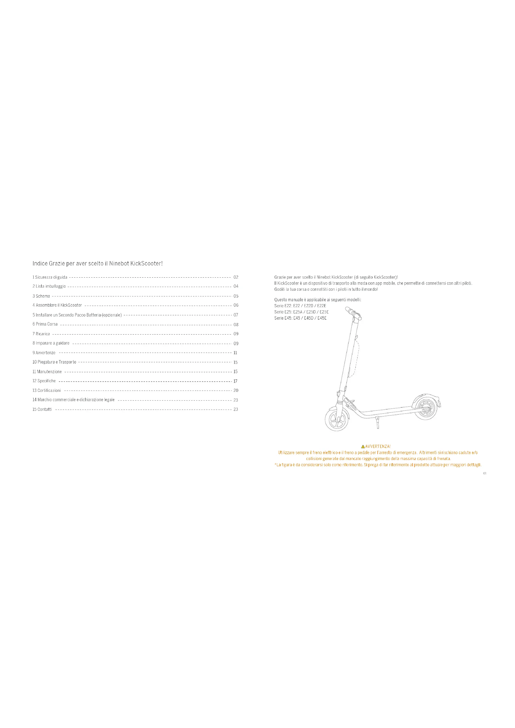 AVVERTENZA! Utilizzare sempre il freno elettrico e il freno a pedale per l’arresto di emergenza. Altrimenti si rischiano cadute e/o collisioni generate dal mancato raggiungimento della massima capacità di frenata. *La figura è da considerarsi solo come riferimento. Si prega di far riferimento al prodotto attuale per maggiori dettagli.02 03 1 Sicurezza di Guida 1. Il KickScooter è un trasportatore ricreativo. Prima di padroneggiare le abilità di guida, è necessario fare pratica. Né Ninebot Inc. o Segway Inc. saranno responsabili di eventuali lesioni o danni causati dall’inesperienza di un pilota o dal mancato rispetto delle istruzioni di questo documento. 2. Si prega di comprendere che è possibile ridurre il rischio seguendo tutte le istruzioni e gli avvisi contenuti nel presente manuale, ma non è possibile eliminare tutti i rischi. Ricordare che ogni volta che si guida il KickScooter si rischiano lesioni da perdite di controllo, collisioni e cadute. Quando si entra negli spazi pubblici, rispettare sempre le leggi e le normative locali. Come con altri veicoli, velocità maggiori richiedono una distanza di frenata maggiore. Una frenata improvvisa su basse superfici di trazione potrebbe portare a scivolare o cadere. Prestare attenzione e mantenere sempre una distanza sicura tra sé stessi e le altre persone o veicoli quando si guida. Essere attenti e rallentare quando si entra in aree sconosciute. 3. Indossare sempre un casco durante la corsa. Utilizzare un casco di bicicletta o skateboard approvato che si adatti correttamente con la cinghia del mento in posizione e fornisca protezione per la nuca. 4. Non tentare la prima corsa in nessuna zona in cui si trovino dei bambini, pedoni, animali domestici, veicoli, biciclette o altri ostacoli e pericoli potenziali. 5. Rispettare i pedoni, dando loro sempre la precedenza. Sorpassare a sinistra quando possibile. Quando ci si avvicina a un pedone dalla parte anteriore, rimanere a destra e rallentare. Evitare i pedoni insicuri nella loro marcia. Quando ci si avvicina da dietro, farsi notare e rallentare portandosi alla velocità di marcia normale quando si sorpassa. Osservare le leggi e i regolamenti sul traffico locale se la situazione è diversa. 6. Nei luoghi non presidiati dalla legge, rispettare le linee guida di sicurezza descritte in questo manuale. Né Ninebot Inc. o Segway Inc. saranno responsabili di eventuali danni alla proprietà, lesioni personali/decessi, incidenti o contenziosi legali causati da violazioni delle istruzioni di sicurezza. 7. Non permettere a chiunque di guidare il proprio KickScooter se non ha letto attentamente questo manuale e ha seguito il tutorial di New Rider nell'app. La sicurezza dei nuovi piloti ricade sotto la tua responsabilità. Aiutare i nuovi piloti fino a quando non sono a loro agio con il funzionamento di base del KickScooter. Assicurarsi che ogni nuovo pilota indossi un casco e altri dispositivi di protezione. 8. Prima di ogni giro, verificare che non ci siano componenti allentati e danneggiati. Se KickScooter emette suoni anomali o segnala un allarme, interrompere immediatamente la corsa. Diagnosticare il proprio KickScooter tramite il Segway-Ninebot App e contattare il proprio rivenditore/distributore per l’assistenza. 9. Stare allerta! Analizzare l’ambiente ben lontano e di fronte al KickScooter - gli occhi sono lo strumento migliore per evitare in modo sicuro gli ostacoli e le superfici a bassa trazione (ivi compreso, ma non limitato a, terreno bagnato, sabbia sciolta, ghiaia sciolta e ghiaccio). 10. Per ridurre il rischio di lesioni, è necessario leggere e seguire tutte le informazioni di "ATTENZIONE" e "AVVERTENZA" in questo documento. Non correre ad una velocità non sicura. In nessuna circostanza bisogna guidare su strade dove circolano autoveicoli. Il produttore consiglia l’utilizzo a guidatori maggiori di anni 14. Seguire sempre queste istruzioni di sicurezza: A. Le persone che non devono guidare il KickScooter includono:
