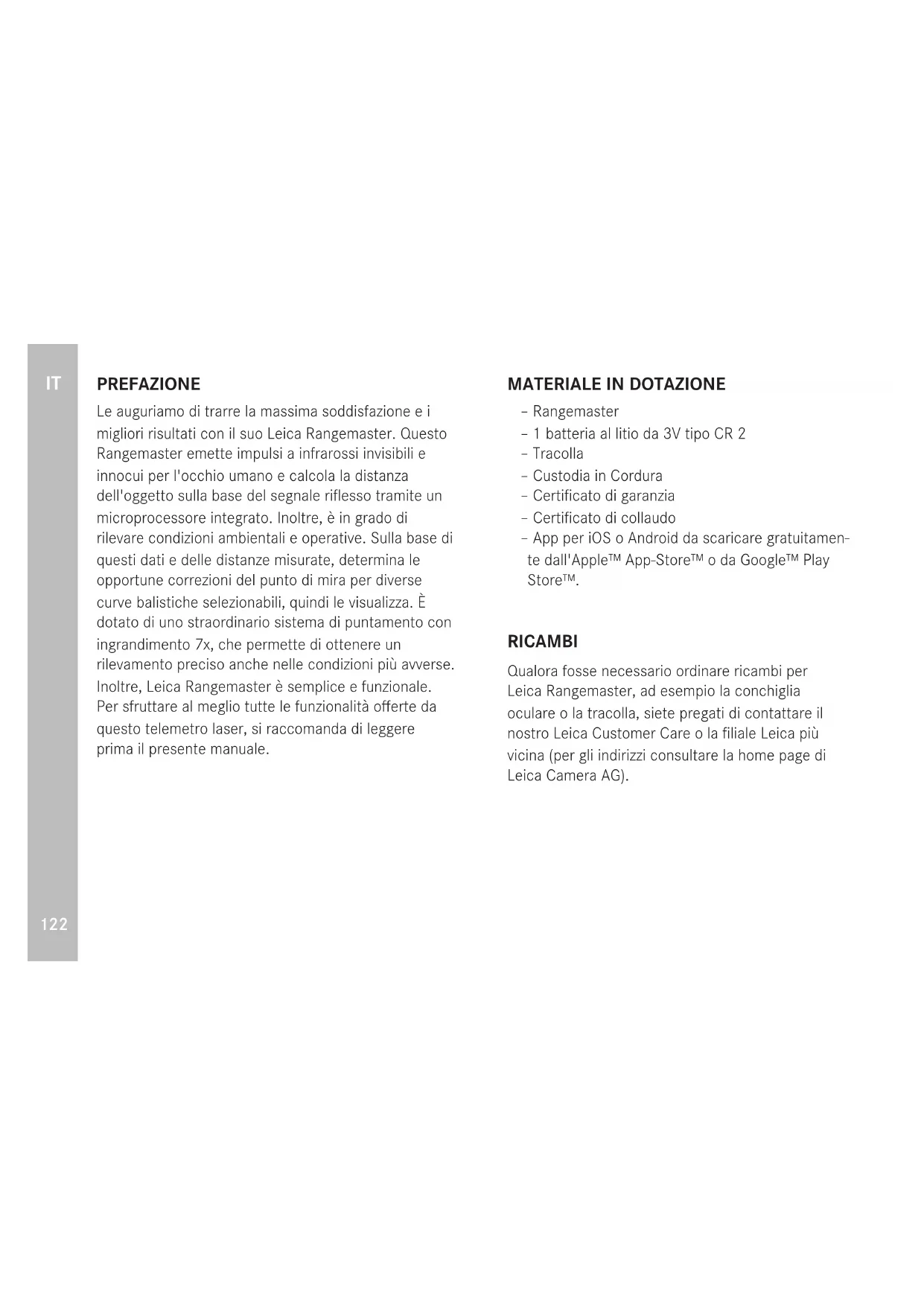 – Rangemaster – 1 batteria al litio da 3V tipo CR 2 – Tracolla – Custodia in Cordura – Certificato di garanzia – Certificato di collaudo – App per iOS o Android da scaricare gratuitamen- te dall'Apple™ App-Store™ o da Google™ Play Store™. RICAMBI Qualora fosse necessario ordinare ricambi per Leica Rangemaster, ad esempio la conchiglia oculare o la tracolla, siete pregati di contattare il nostro Leica Customer Care o la filiale Leica più vicina (per gli indirizzi consultare la home page di Leica Camera AG). PREFAZIONE Le auguriamo di trarre la massima soddisfazione e i migliori risultati con il suo Leica Rangemaster. Questo Rangemaster emette impulsi a infrarossi invisibili e innocui per l'occhio umano e calcola la distanza dell'oggetto sulla base del segnale riflesso tramite un microprocessore integrato. Inoltre, è in grado di rilevare condizioni ambientali e operative. Sulla base di questi dati e delle distanze misurate, determina le opportune correzioni del punto di mira per diverse curve balistiche selezionabili, quindi le visualizza. È dotato di uno straordinario sistema di puntamento con ingrandimento 7x, che permette di ottenere un rilevamento preciso anche nelle condizioni più avverse. Inoltre, Leica Rangemaster è semplice e funzionale. Per sfruttare al meglio tutte le funzionalità offerte da questo telemetro laser, si raccomanda di leggere prima il presente manuale.IT