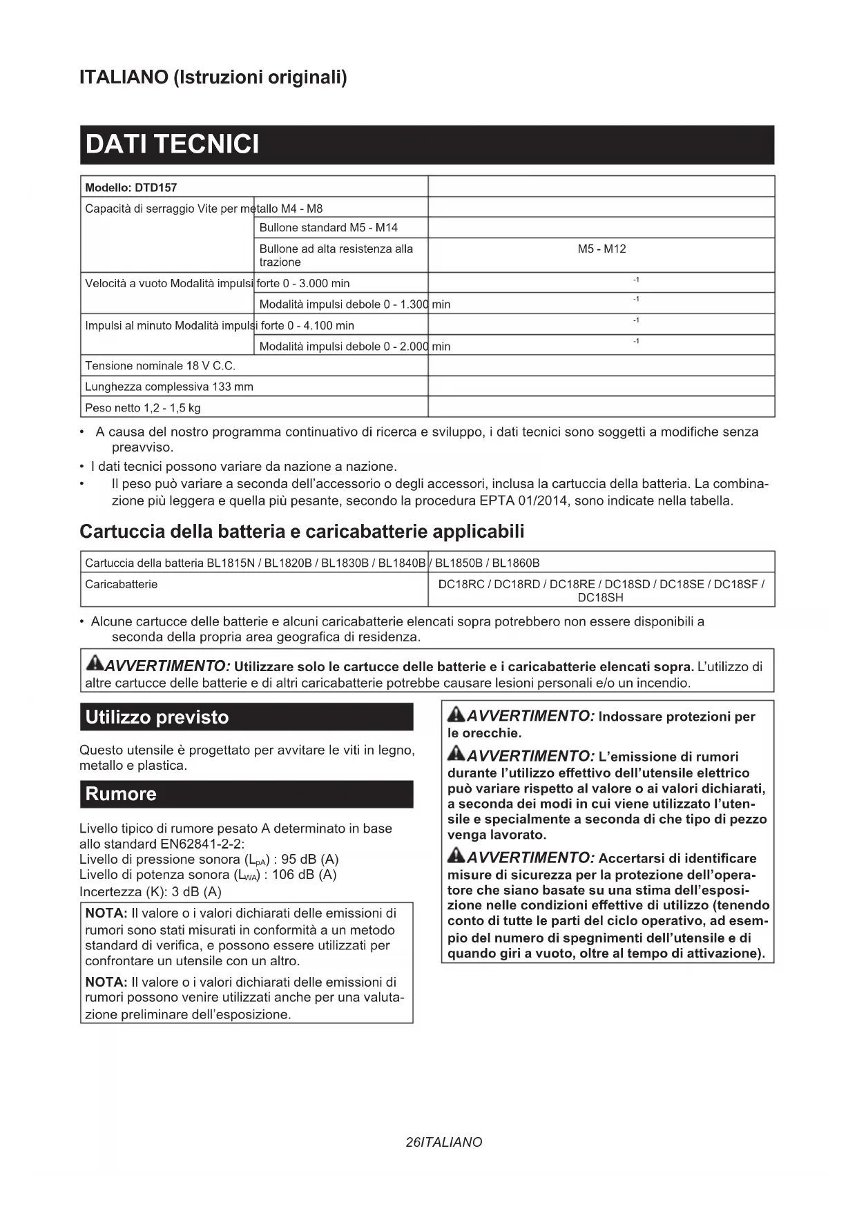 - Alcune cartucce delle batterie e alcuni caricabatterie elencati sopra potrebbero non essere disponibili a secondadellapropriaareageogracadiresidenza. AVVERTIMENTO: Utilizzare solo le cartucce delle batterie e i caricabatterie elencati sopra. L’utilizzo di altre cartucce delle batterie e di altri caricabatterie potrebbe causare lesioni personali e/o un incendio. Utilizzo previsto Questoutensileèprogettatoperavvitarelevitiinlegno, metallo e plastica. Rumore Livello tipico di rumore pesato A determinato in base allo standard EN62841-2-2: Livellodipressionesonora(L