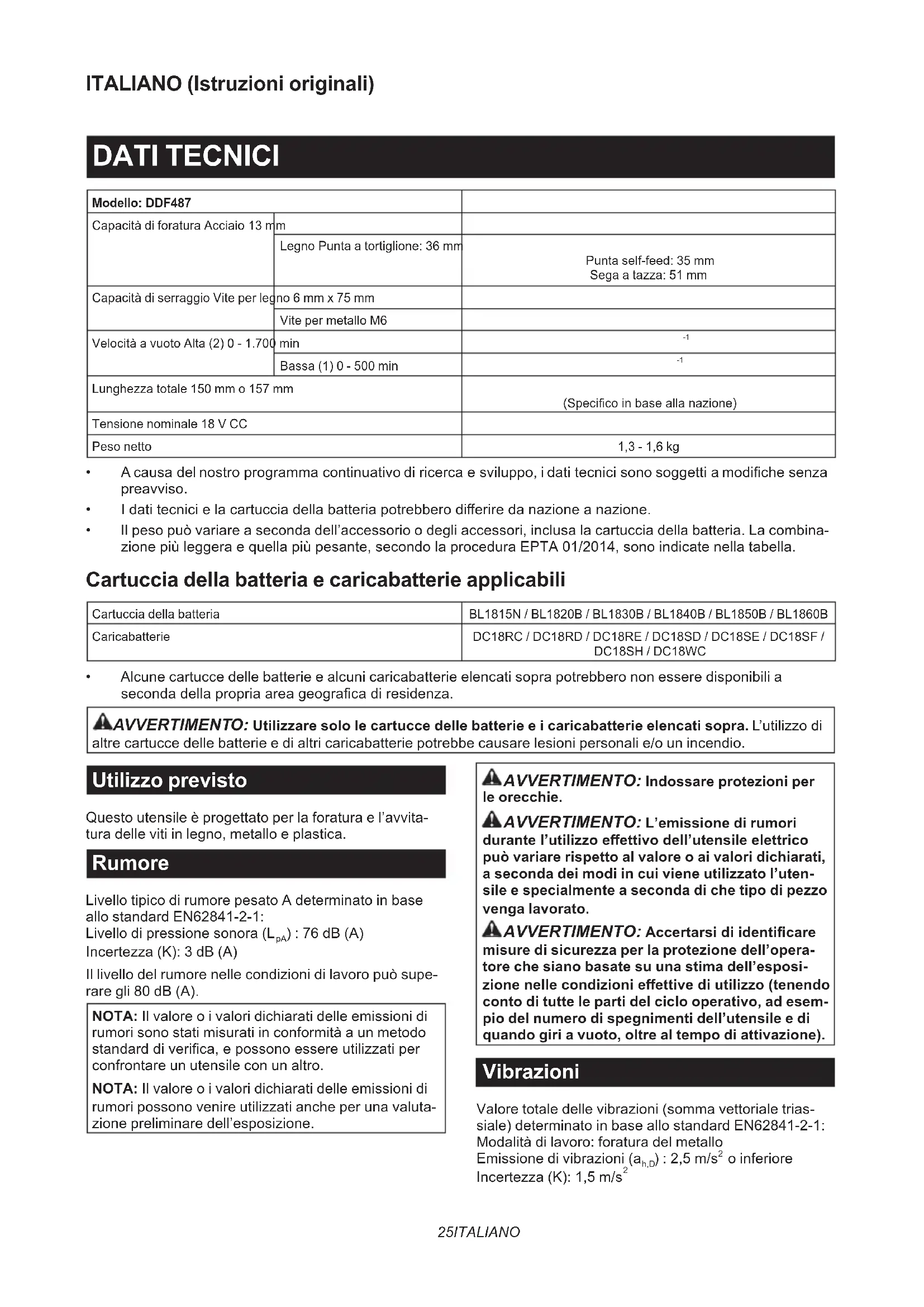 - Alcune cartucce delle batterie e alcuni caricabatterie elencati sopra potrebbero non essere disponibili a seconda della propria area geograca di residenza. AVVERTIMENTO: Utilizzare solo le cartucce delle batterie e i caricabatterie elencati sopra. L’utilizzo di altre cartucce delle batterie e di altri caricabatterie potrebbe causare lesioni personali e/o un incendio. Utilizzo previsto Questo utensile è progettato per la foratura e l’avvita- tura delle viti in legno, metallo e plastica. Rumore Livello tipico di rumore pesato A determinato in base allo standard EN62841-2-1: Livello di pressione sonora (L
