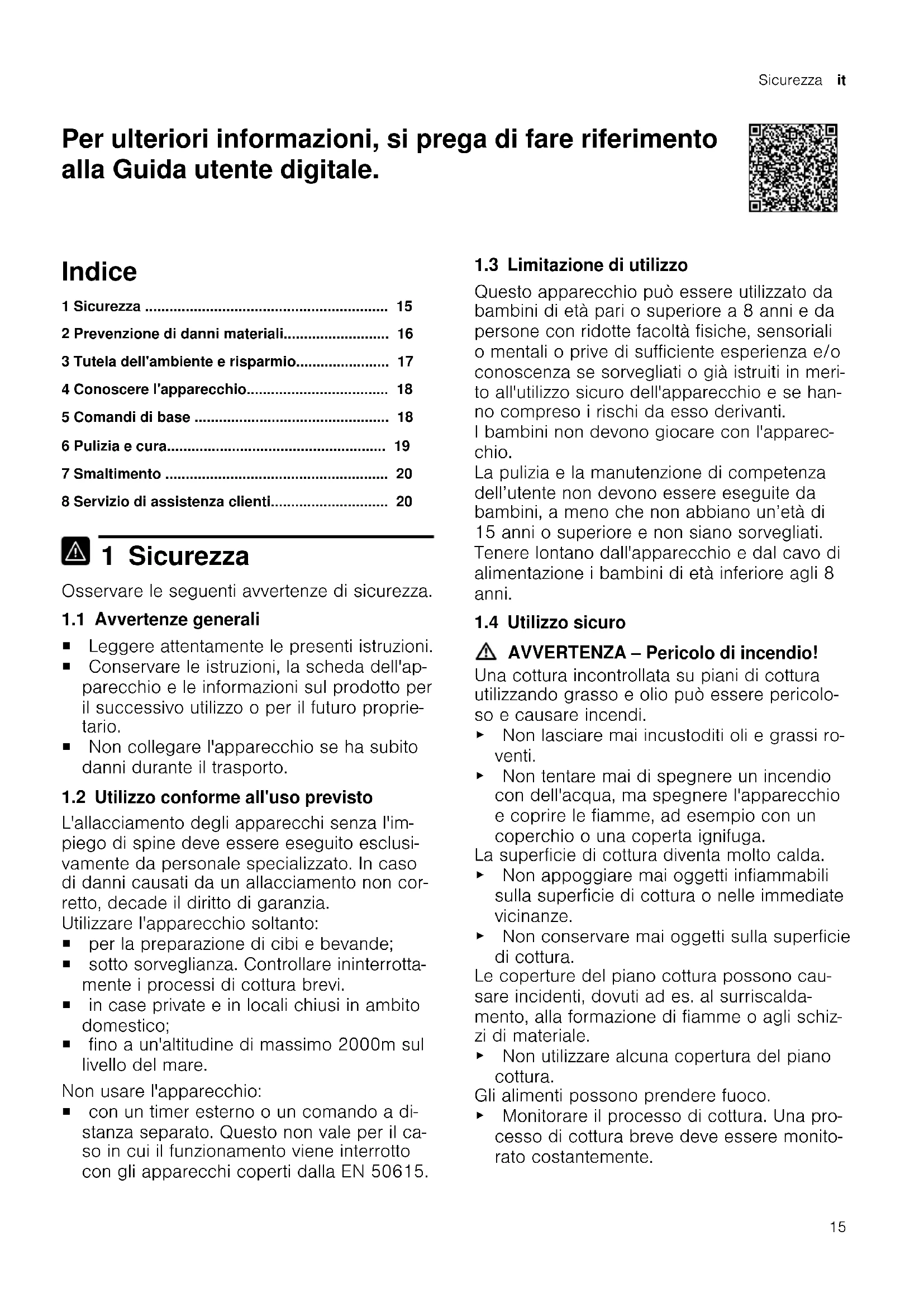 - 8 Servizio di assistenza clienti 1 Sicurezza Osservare le seguenti avvertenze di sicurezza. 1.1 Avvertenze generali ¡ Leggere attentamente le presenti istruzioni. ¡ Conservare le istruzioni, la scheda dell'ap- parecchio e le informazioni sul prodotto per il successivo utilizzo o per il futuro proprie- tario. ¡ Non collegare l'apparecchio se ha subito danni durante il trasporto. 1.2 Utilizzo conforme all'uso previsto L'allacciamento degli apparecchi senza l'im- piego di spine deve essere eseguito esclusi- vamente da personale specializzato. In caso di danni causati da un allacciamento non cor- retto, decade il diritto di garanzia. Utilizzare l'apparecchio soltanto: ¡ per la preparazione di cibi e bevande; ¡ sotto sorveglianza. Controllare ininterrotta- mente i processi di cottura brevi. ¡ in case private e in locali chiusi in ambito domestico; ¡ fino a un'altitudine di massimo 2000m sul livello del mare. Non usare l'apparecchio: ¡ con un timer esterno o un comando a di- stanza separato. Questo non vale per il ca- so in cui il funzionamento viene interrotto con gli apparecchi coperti dalla EN50615. 1.3 Limitazione di utilizzo Questo apparecchio può essere utilizzato da bambini di età pari o superiore a 8 anni e da persone con ridotte facoltà fisiche, sensoriali o mentali o prive di sufficiente esperienza e/o conoscenza se sorvegliati o già istruiti in meri- to all'utilizzo sicuro dell'apparecchio e se han- no compreso i rischi da esso derivanti. I bambini non devono giocare con l'apparec- chio. La pulizia e la manutenzione di competenza dell’utente non devono essere eseguite da bambini, a meno che non abbiano un’età di 15 anni o superiore e non siano sorvegliati. Tenere lontano dall'apparecchio e dal cavo di alimentazione i bambini di età inferiore agli 8 anni. 1.4 Utilizzo sicuro AVVERTENZA‒Pericolo di incendio! Una cottura incontrollata su piani di cottura utilizzando grasso e olio può essere pericolo- so e causare incendi. ▶ Non lasciare mai incustoditi oli e grassi ro- venti. ▶ Non tentare mai di spegnere un incendio con dell'acqua, ma spegnere l'apparecchio e coprire le fiamme, ad esempio con un coperchio o una coperta ignifuga. La superficie di cottura diventa molto calda. ▶ Non appoggiare mai oggetti infiammabili sulla superficie di cottura o nelle immediate vicinanze. ▶ Non conservare mai oggetti sulla superficie di cottura. Le coperture del piano cottura possono cau- sare incidenti, dovuti ad es. al surriscalda- mento, alla formazione di fiamme o agli schiz- zi di materiale. ▶ Non utilizzare alcuna copertura del piano cottura. Gli alimenti possono prendere fuoco. ▶ Monitorare il processo di cottura. Una pro- cesso di cottura breve deve essere monito- rato costantemente.it Prevenzione di danni materiali p. 20