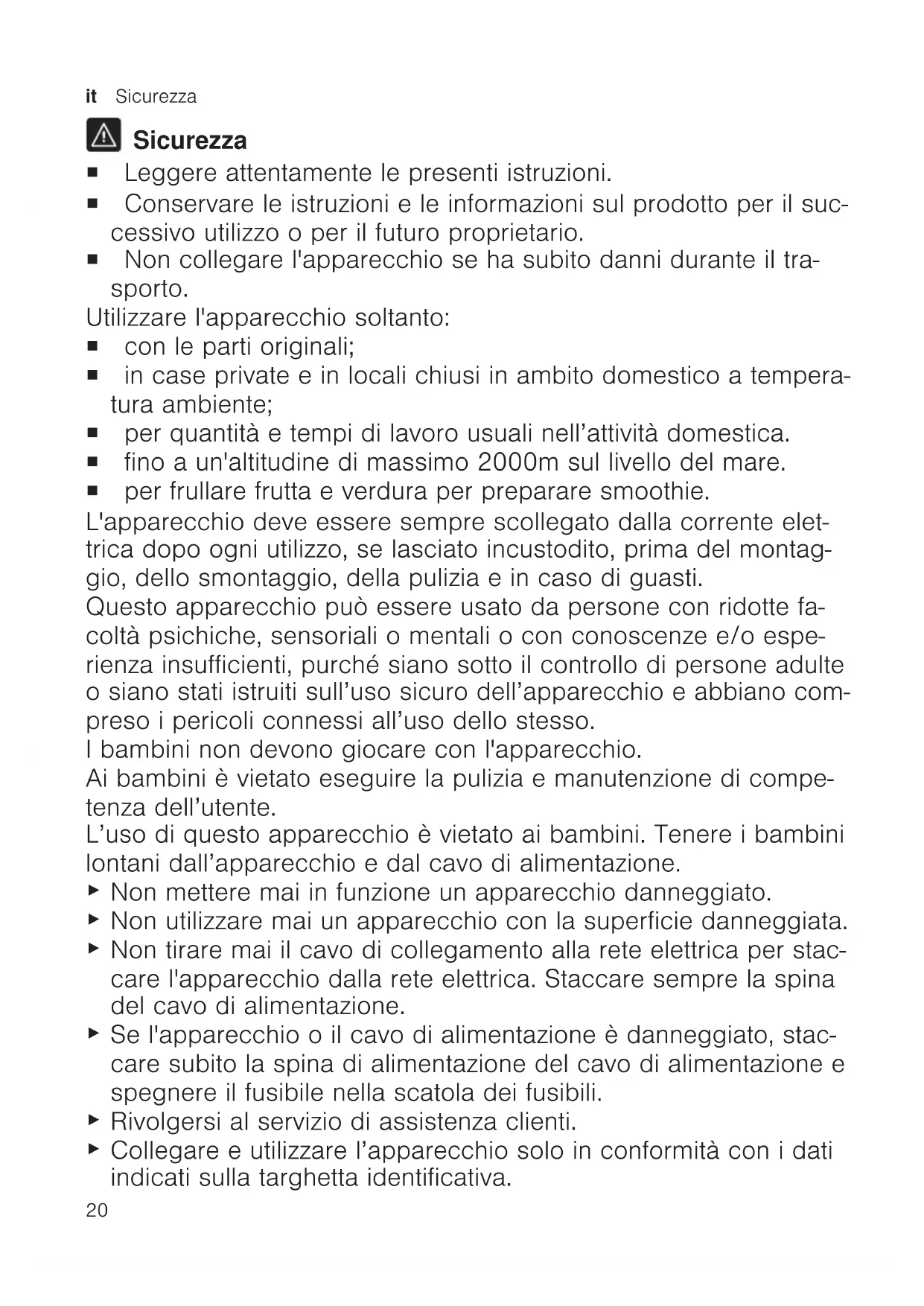 Sicurezza ¡ Leggere attentamente le presenti istruzioni. ¡ Conservare le istruzioni e le informazioni sul prodotto per il suc- cessivo utilizzo o per il futuro proprietario. ¡ Non collegare l'apparecchio se ha subito danni durante il tra- sporto. Utilizzare l'apparecchio soltanto: ¡ con le parti originali; ¡ in case private e in locali chiusi in ambito domestico a tempera- tura ambiente; ¡ per quantità e tempi di lavoro usuali nell’attività domestica. ¡ fino a un'altitudine di massimo 2000m sul livello del mare. ¡ per frullare frutta e verdura per preparare smoothie. L'apparecchio deve essere sempre scollegato dalla corrente elet- trica dopo ogni utilizzo, se lasciato incustodito, prima del montag- gio, dello smontaggio, della pulizia e in caso di guasti. Questo apparecchio può essere usato da persone con ridotte fa- coltà psichiche, sensoriali o mentali o con conoscenze e/o espe- rienza insufficienti, purché siano sotto il controllo di persone adulte o siano stati istruiti sull’uso sicuro dell’apparecchio e abbiano com- preso i pericoli connessi all’uso dello stesso. I bambini non devono giocare con l'apparecchio. Ai bambini è vietato eseguire la pulizia e manutenzione di compe- tenza dell’utente. L’uso di questo apparecchio è vietato ai bambini. Tenere i bambini lontani dall’apparecchio e dal cavo di alimentazione.