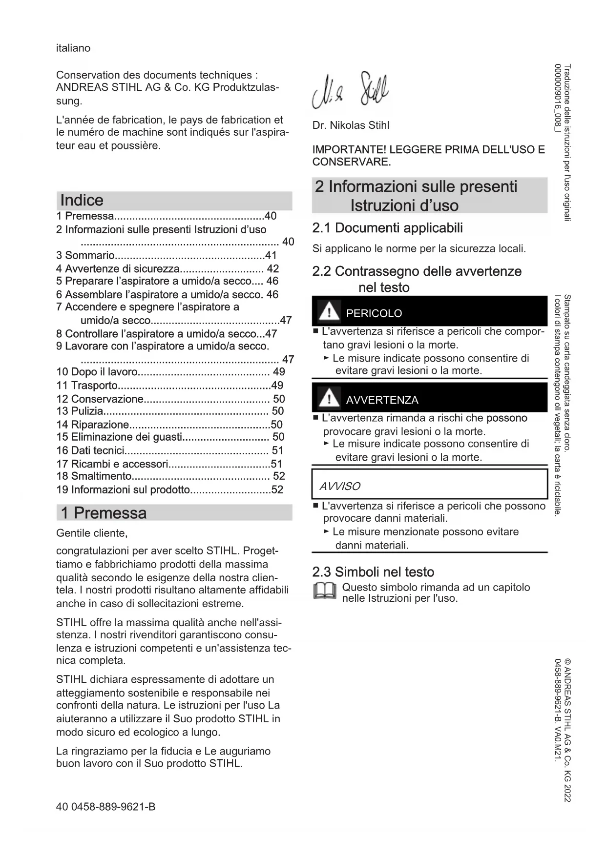 - 19 Informazioni sul prodotto 1 Premessa Gentile cliente, congratulazioni per aver scelto STIHL. Proget‐ tiamo e fabbrichiamo prodotti della massima qualità secondo le esigenze della nostra clien‐ tela. I nostri prodotti risultano altamente affidabili anche in caso di sollecitazioni estreme. STIHL offre la massima qualità anche nell'assi‐ stenza. I nostri rivenditori garantiscono consu‐ lenza e istruzioni competenti e un'assistenza tec‐ nica completa. STIHL dichiara espressamente di adottare un atteggiamento sostenibile e responsabile nei confronti della natura. Le istruzioni per l'uso La aiuteranno a utilizzare il Suo prodotto STIHL in modo sicuro ed ecologico a lungo. La ringraziamo per la fiducia e Le auguriamo buon lavoro con il Suo prodotto STIHL. Dr. Nikolas Stihl p. 52