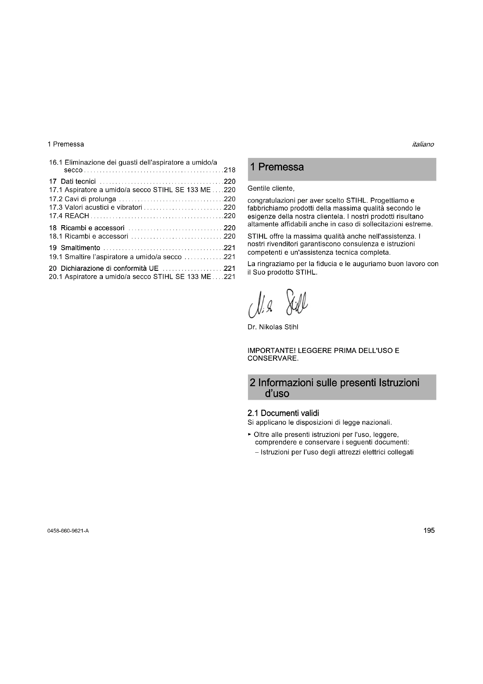 italiano 1 Premessa Gentile cliente, congratulazioni per aver scelto STIHL. Progettiamo e fabbrichiamo prodotti della massima qualità secondo le esigenze della nostra clientela. I nostri prodotti risultano altamente affidabili anche in caso di sollecitazioni estreme. STIHL offre la massima qualità anche nell'assistenza. I nostri rivenditori garantiscono consulenza e istruzioni competenti e un'assistenza tecnica completa. La ringraziamo per la fiducia e le auguriamo buon lavoro con il Suo prodotto STIHL. Dr. Nikolas Stihl
