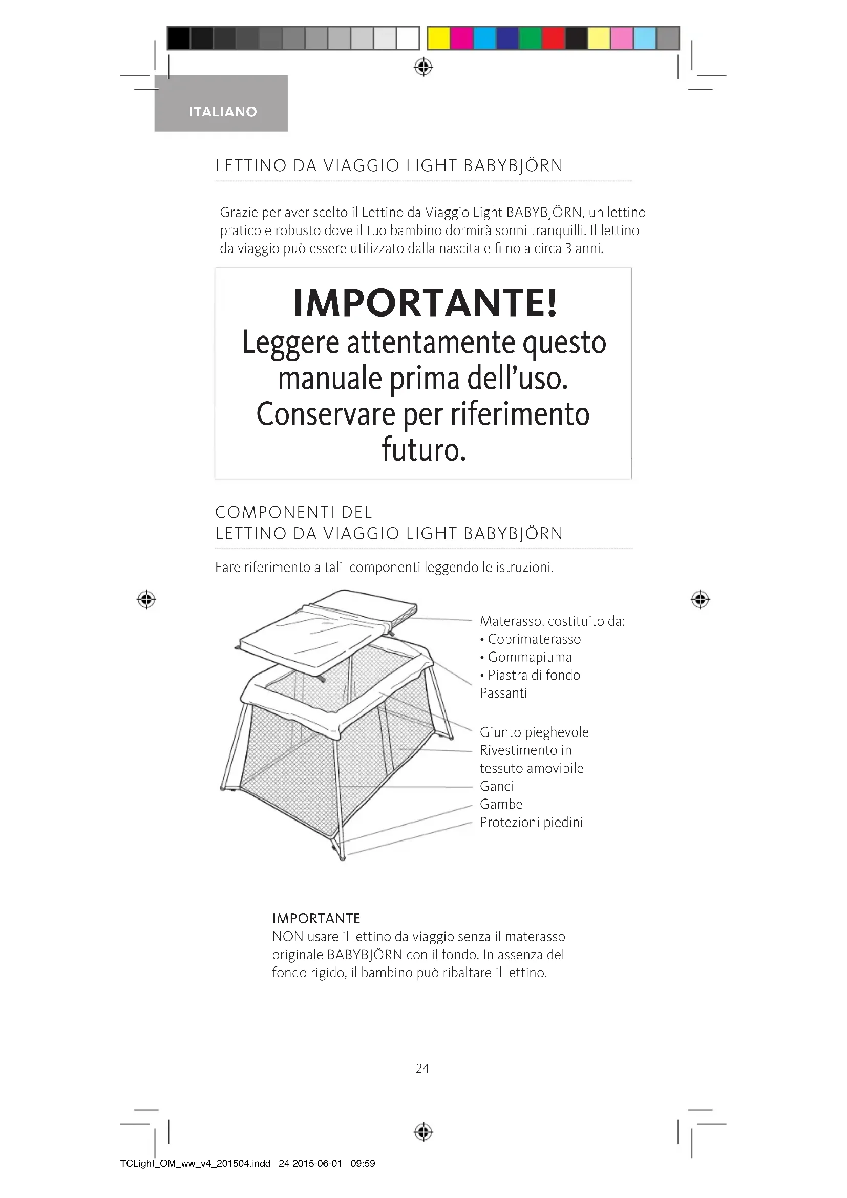 Grazie per aver scelto il Lettino da Viaggio Light BABYBJÖRN, un lettino pratico e robusto dove il tuo bambino dormirà sonni tranquilli. Il lettino da viaggio può essere utilizzato dalla nascita e fi no a circa 3 anni.