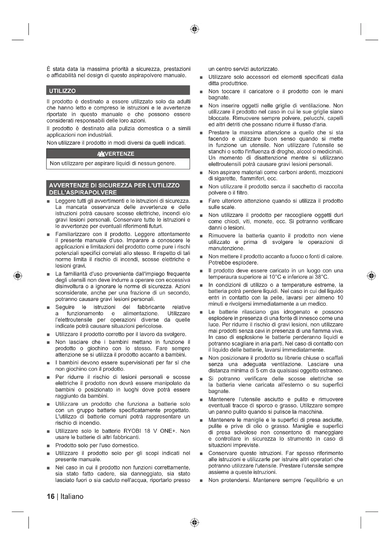 DELL'ASPIRAPOLVERE Ŷ Leggere tutti gli avvertimenti e le istruzioni di sicurezza. La mancata osservanza delle avvertenze e delle istruzioni potrà causare scosse elettriche, incendi e/o gravi lesioni personali. Conservare tutte le istruzioni e le avvertenze per eventuali riferimenti futuri. Ŷ Familiarizzare con il prodotto. Leggere attentamente il presente manuale d'uso. Imparare a conoscere le applicazioni e limitazioni del prodotto come pure i rischi potenziali specifici correlati allo stesso. Il rispetto di tali norme limita il rischio di incendi, scosse elettriche e lesioni gravi. Ŷ La familiarità d'uso proveniente dall'impiego frequente degli utensili non deve indurre a operare con eccessiva disinvoltura o a ignorare le norme di sicurezza. Azioni sconsiderate, anche per una frazione di un secondo, potranno causare gravi lesioni personali. Ŷ Seguire le istruzioni del fabbricante relative a funzionamento e alimentazione. Utilizzare l'elettroutensile per operazioni diverse da quelle indicate potrà causare situazioni pericolose. Ŷ Utilizzare il prodotto corretto per il lavoro da svolgere. Ŷ Non lasciare che i bambini mettano in funzione il prodotto o giochino con lo stesso. Fare sempre attenzione se si utilizza il prodotto accanto a bambini. Ŷ I bambini devono essere supervisionati per far sì che non giochino con il prodotto. Ŷ Per ridurre il rischio di lesioni personali e scosse elettriche il prodotto non dovrà essere manipolato da bambini o posizionato in luoghi dove potrà essere raggiunto da bambini. Ŷ Utilizzare un prodotto che funziona a batterie solo con un gruppo batterie specificatamente progettato. L'utilizzo di batterie comuni potrà rappresentare un rischio di incendio. Ŷ Utilizzare solo le batterie RYOBI 18 V ONE+. Non usare le batterie di altri fabbricanti. Ŷ Prodotto solo per l'uso domestico. Ŷ Utilizzare il prodotto solo per gli scopi indicati nel presente manuale. Ŷ Nel caso in cui il prodotto non funzioni correttamente, sia stato fatto cadere, sia danneggiato, sia stato lasciato fuori o sia caduto nell'acqua, riportarlo presso un centro servizi autorizzato. Ŷ Utilizzare solo accessori ed elementi specificati dalla ditta produttrice. Ŷ Non toccare il caricatore o il prodotto con le mani bagnate. Ŷ Non inserire oggetti nelle griglie di ventilazione. Non utilizzare il prodotto nel caso in cui le sue griglie siano bloccate. Rimuovere sempre polvere, pelucchi, capelli ed altri detriti che possano ridurre il flusso d'aria. Ŷ Prestare la massima attenzione a quello che si sta facendo e utilizzare buon senso quando si mette in funzione un utensile. Non utilizzare l'utensile se stanchi o sotto l'influenza di droghe, alcool o medicinali. Un momento di disattenzione mentre si utilizzano elettroutensili potrà causare gravi lesioni personali. Ŷ Non aspirare materiali come carboni ardenti, mozziconi di sigarette, fiammiferi, ecc. Ŷ Non utilizzare il prodotto senza il sacchetto di raccolta polvere o il filtro. Ŷ Fare ulteriore attenzione quando si utilizza il prodotto sulle scale. Ŷ Non utilizzare il prodotto per raccogliere oggetti duri come chiodi, viti, monete, ecc. Si potranno verificare danni o lesioni. Ŷ Rimuovere la batteria quanto il prodotto non viene utilizzato e prima di svolgere le operazioni di manutenzione. Ŷ Non mettere il prodotto accanto a fuoco o fonti di calore. Potrebbe esplodere. Ŷ Il prodotto deve essere caricato in un luogo con una temperaura superiore ai 10°C e inferiore ai 38°C. Ŷ In condizioni di utilizzo o a temperature estreme, la batteria potrà perdere liquidi. Nel caso in cui del liquido entri in contatto con la pelle, lavarsi per almeno 10 minuti e rivolgersi immediatamente a un medico. Ŷ Le batterie rilasciano gas idrogenato e possono esplodere in presenza di una fonte di innesco come una luce. Per ridurre il rischio di gravi lesioni, non utilizzare mai prodotti senza cavi in presenza di una fiamma viva. In caso di esplosione le batterie perderanno liquidi e potranno scagliare in aria parti. Nel caso di contatto con il liquido delle batterie, lavarsi immediatamente. Ŷ Non posizionare il prodotto su librerie chiuse o scaffali senza una adeguata ventilazione. Lasciare una distanza minima di 5 cm da qualsiasi oggetto estraneo. Ŷ Si potranno verificare delle scosse elettriche se la batteria viene caricata all'esterno o su superfici bagnate. Ŷ Mantenere l’utensile asciutto e pulito e rimuovere eventuali tracce di sporco e grasso. Utilizzare sempre un panno pulito quando si pulisce la macchina. Ŷ Mantenere le maniglie e le superfici di presa asciutte, pulite e prive di olio o grasso. Maniglie e superfici di presa scivolose non consentono di maneggiare e controllare in sicurezza lo strumento in caso di situazioni impreviste. Ŷ Conservare queste istruzioni. Far spesso riferimento alle istruzioni e utilizzarle per istruire altri operatori che potranno utilizzare l'utensile. Prestare l’utensile sempre assieme a queste istruzioni. Ŷ Non protendersi. Mantenere sempre l’equilibrio e un17 Italiano |