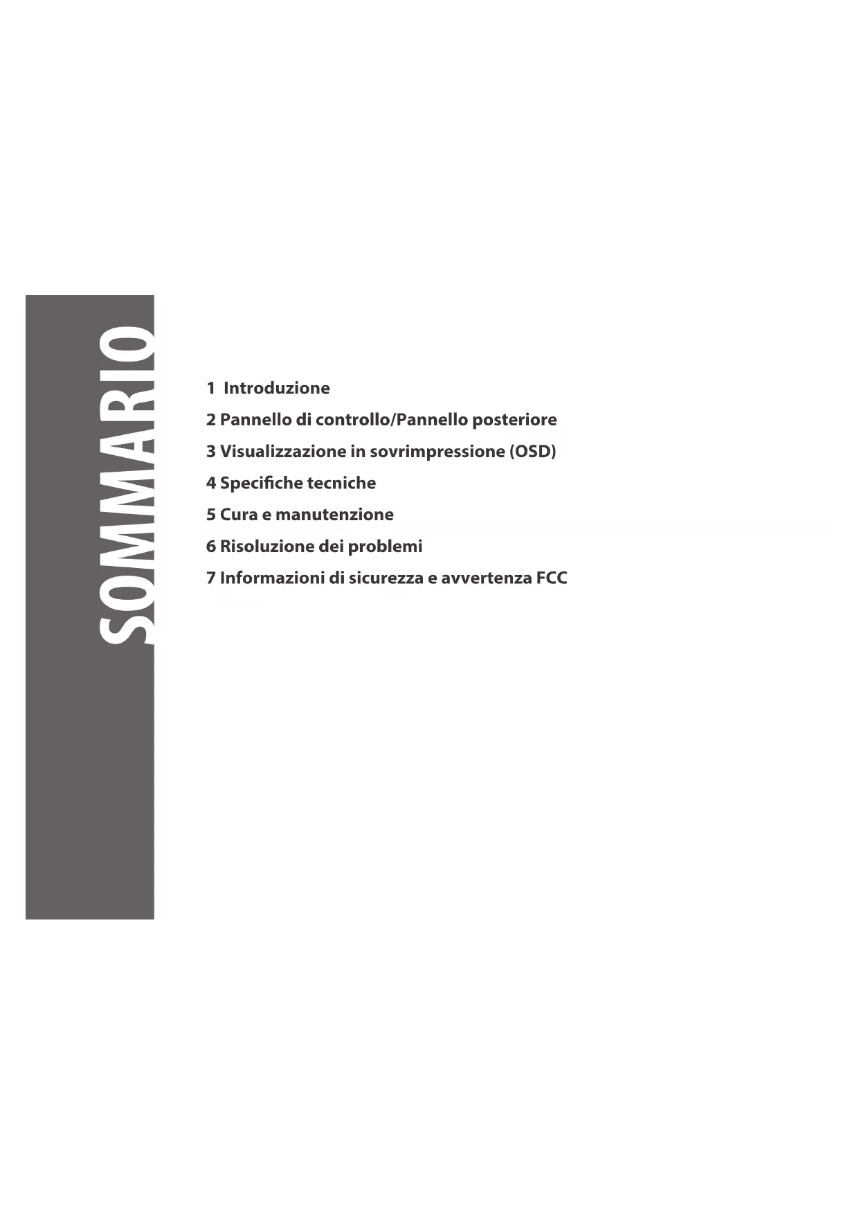 L27ADS Monitor LED Widescreen Full HD da 27”SOMMARIO 1 Introduzione 2 Pannello di controllo/Pannello posteriore 3 Visualizzazione in sovrimpressione (OSD) 4 Speciche tecniche 5 Cura e manutenzione 6 Risoluzione dei problemi 7 Informazioni di sicurezza e avvertenza FCC1 INTRODUZIONE Contenuto della confezione