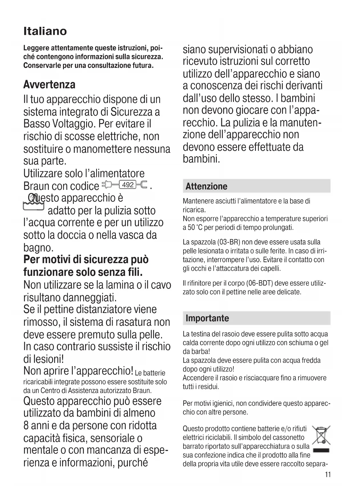 Questo apparecchio è adatto per la pulizia sotto l’acqua corrente e per un utilizzo sotto la doccia o nella vasca da bagno. Per motivi di sicurezza può funzionare solo senza fili. Non utilizzare se la lamina o il cavo risultano danneggiati. Se il pettine distanziatore viene rimosso, il sistema di rasatura non deve essere premuto sulla pelle. In caso contrario sussiste il rischio di lesioni! Non aprire l’apparecchio! Le batterie ricaricabili integrate possono essere sostituite solo da un Centro di Assistenza autorizzato Braun. Questo apparecchio può essere utilizzato da bambini di almeno 8 anni e da persone con ridotta capacità fisica, sensoriale o mentale o con mancanza di espe- rienza e informazioni, purché siano supervisionati o abbiano ricevuto istruzioni sul corretto utilizzo dell’apparecchio e siano a conoscenza dei rischi derivanti dall’uso dello stesso. I bambini non devono giocare con l’appa- recchio. La pulizia e la manuten- zione dell’apparecchio non devono essere effettuate da bambini. Attenzione Mantenere asciutti l’alimentatore e la base di ricarica. Non esporre l’apparecchio a temperature superiori a 50 °C per periodi di tempo prolungati. La spazzola (03-BR) non deve essere usata sulla pelle lesionata o irritata o sulle ferite. In caso di irri- tazione, interrompere l’uso. Evitare il contatto con gli occhi e l’attaccatura dei capelli. Il rifinitore per il corpo (06-BDT) deve essere utiliz- zato solo con il pettine nelle aree delicate. Importante La testina del rasoio deve essere pulita sotto acqua calda corrente dopo ogni utilizzo con schiuma o gel da barba! La spazzola deve essere pulita con acqua fredda dopo ogni utilizzo! Accendere il rasoio e risciacquare fino a rimuovere tutti i residui. Per motivi igienici, non condividere questo apparec- chio con altre persone. Questo prodotto contiene batterie e/o rifiuti elettrici riciclabili. Il simbolo del cassonetto barrato riportato sull’apparecchiatura o sulla sua confezione indica che il prodotto alla fine della propria vita utile deve essere raccolto separa- Italiano 91972600_S6_Euro.indd 1191972600_S6_Euro.indd 11 04.01.19 09:2504.01.19 09:25 Business Use - P&G AUTHORIZED POA-00096225 Rev 001 Effective Date 2019-01-04 Printed 2020-03-20 Page 11 of 5612 tamente dagli altri rifiuti. L’utente dovrà, pertanto, conferire l’apparecchiatura giunta a fine vita agli idonei centri comunali di raccolta differenziata dei rifiuti elettrotecnici ed elettronici. In alternativa alla gestione autonoma è possibile consegnare l’appa- recchiatura che si desidera smaltire al rivenditore, al momento dell’acquisto di una nuova apparecchia- tura di tipo equivalente. Presso i rivenditori di pro- dotti elettronici con superficie di vendita di almeno 400 m